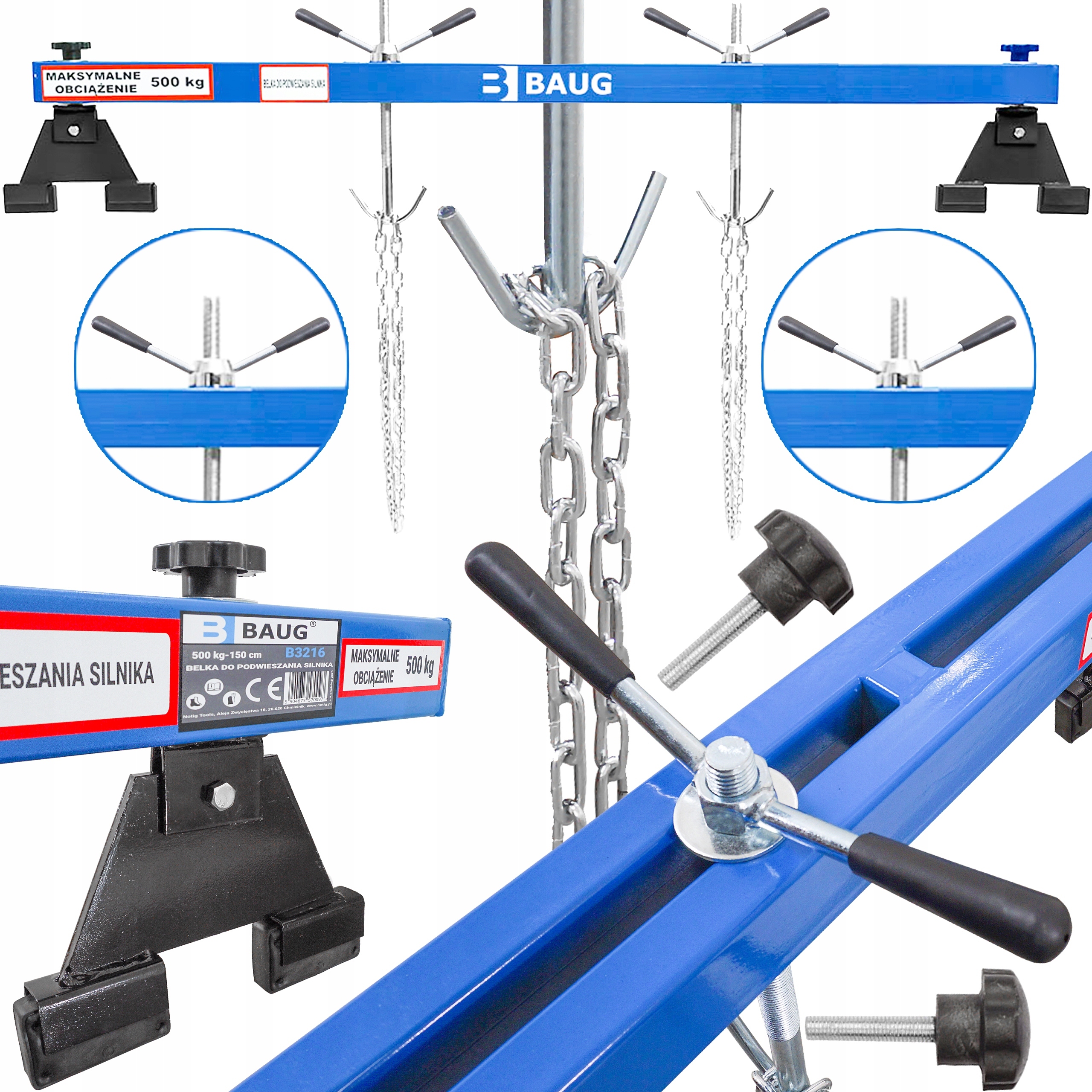Profesjonalna belka do podwieszania silnika. Niezastąpiona podczas wymiany sprzęgła czy poduszek mocujących silnik. W sposób pewny i bezpieczny pozwala zabezpieczyć jednostkę w ustalonej pozycji. Udźwig 500 kg. Idealna do domowego garażu jak i profesjonalnego warsztatu.