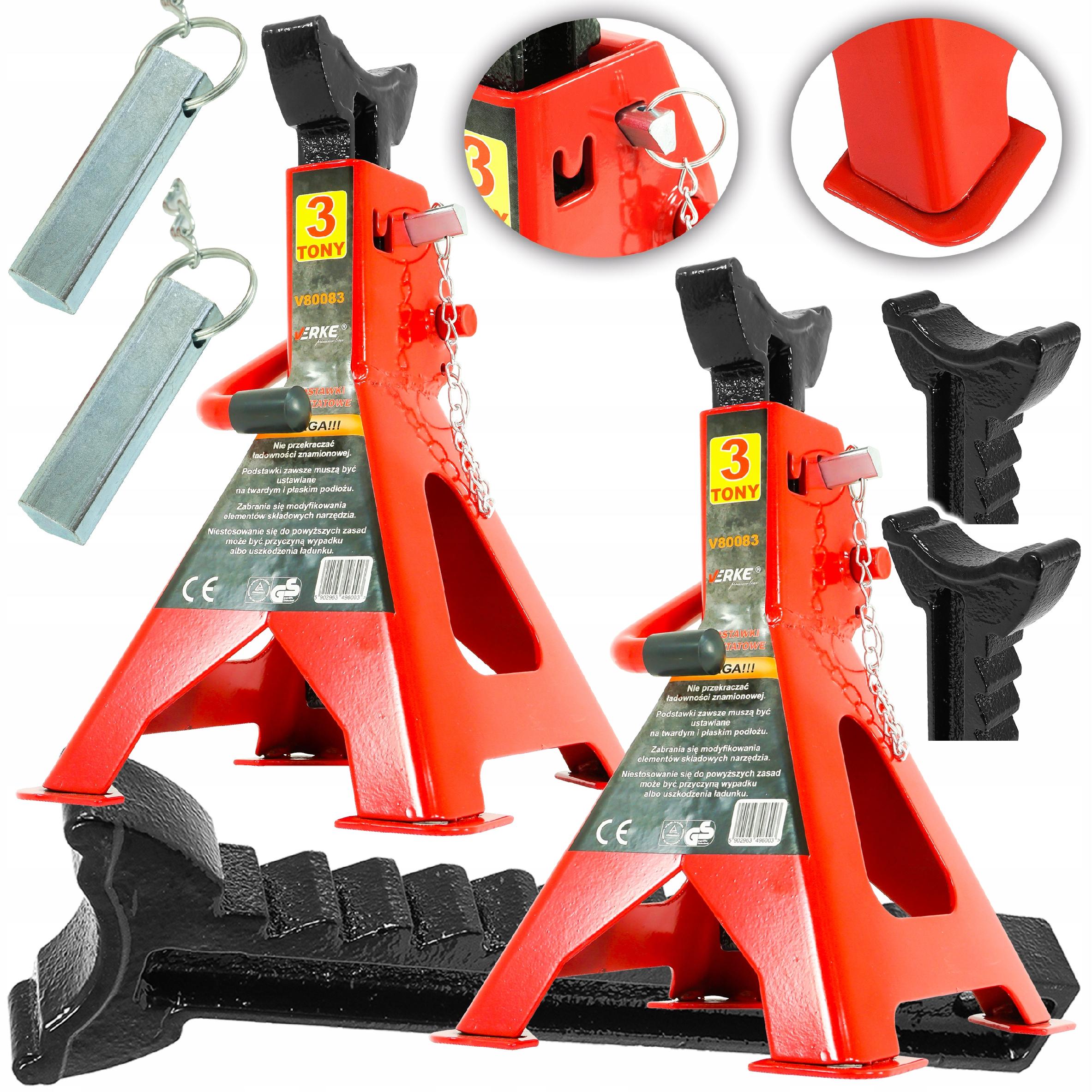 Profesjonalne podstawki samochodowe 3T marki Verke Premium Line. Podstawki wykonane z grubych stalowych profili, posiadają wygodną w obsłudze zapadkową blokadę wysokości oraz dodatkowy klin zabezpieczający, co zapewnia maksymalny poziom bezpieczeństwa, niedostępny w innych modelach. Dodatkowym atutem tych podstawek jest nóżka zakończona szeroką stopą, dzięki której podstawki nie wbijają się w podłoże pod naciskiem podpartego przedmiotu. Chroni to podłożę przed zniszczeniem oraz zwiększa stabilność podpór. Ich solida i mocna konstrukcja zapewnia sprawne i długotrwałe użytkowanie. Szczególnie dedykowane profesjonalnym warsztatom samochodowym ale znajdzie również zastosowanie w przydomowych garażach. Idealne narzędzia dla mechaników jak i wszystkich zmotoryzowanych.