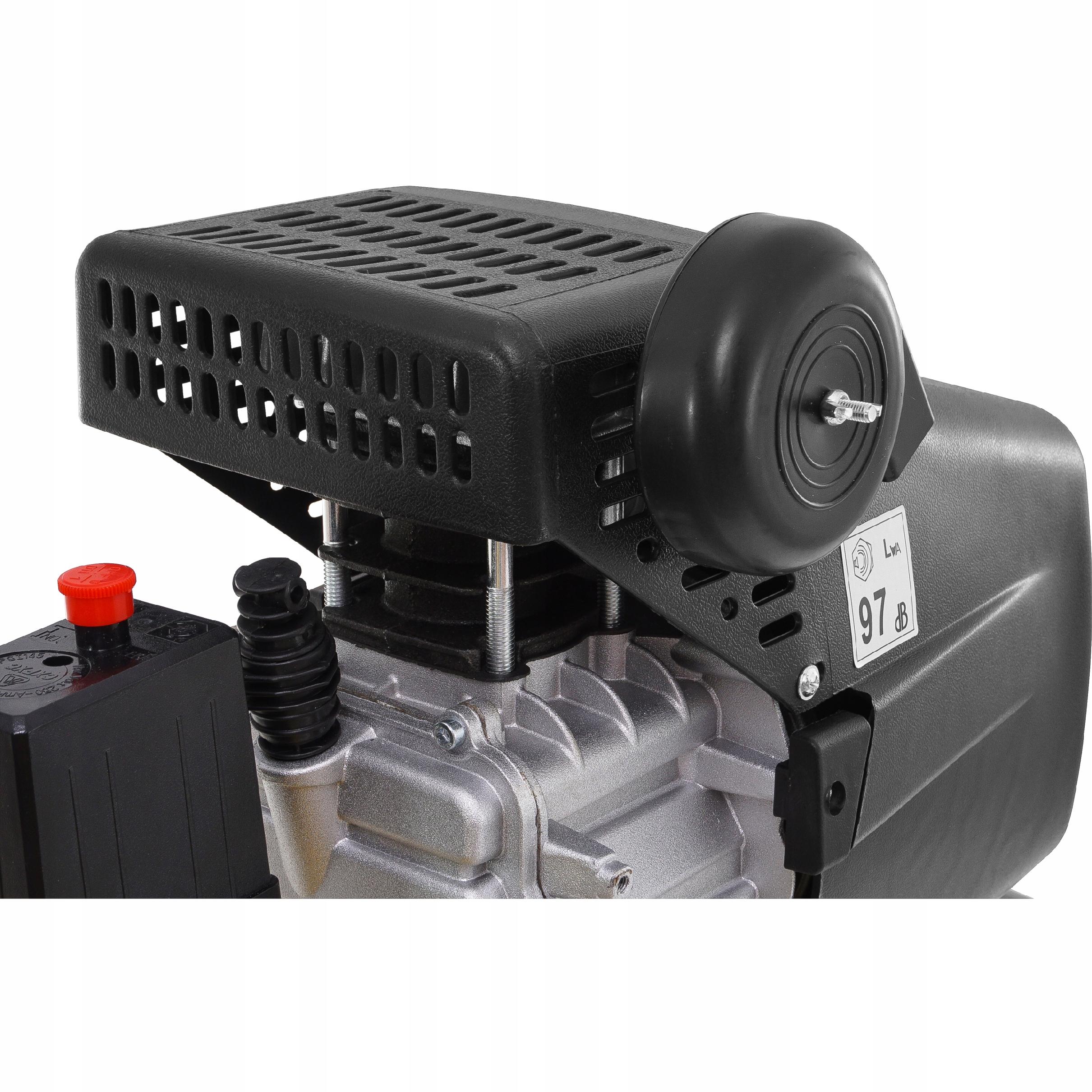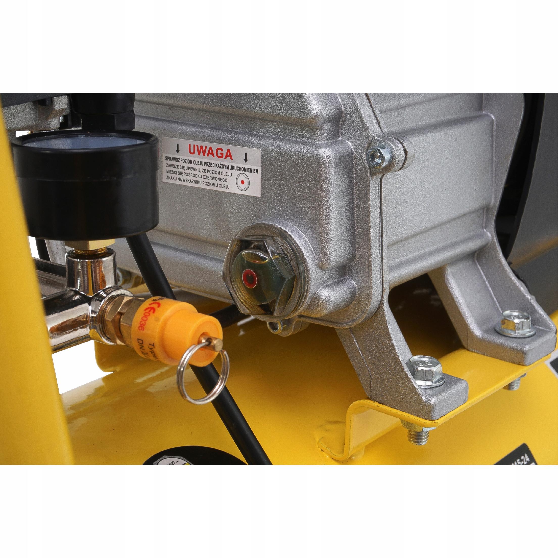 Kompresor wyposażony jest w wziernik poziomu oleju oraz zawór bezpieczeństwa, który służy do awaryjnego spuszczania nadmiaru powietrza z butli kompresora zapobiegając uszkodzeniu butli lub instalacji.