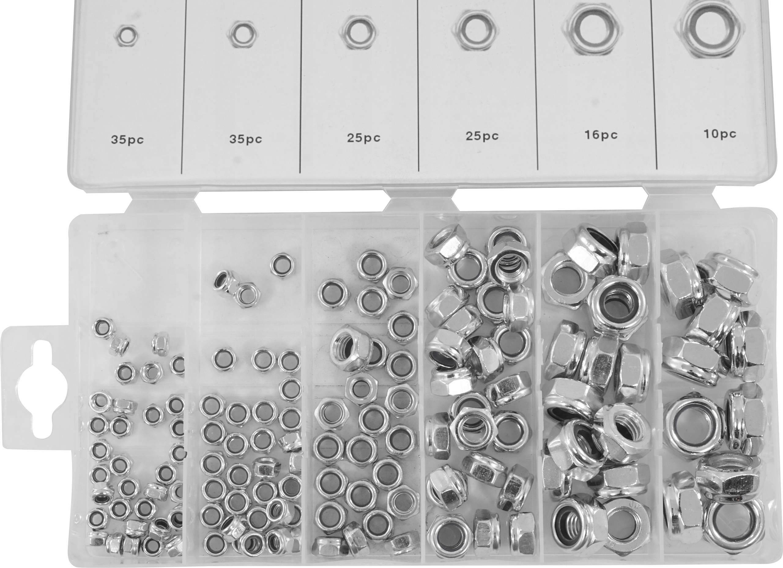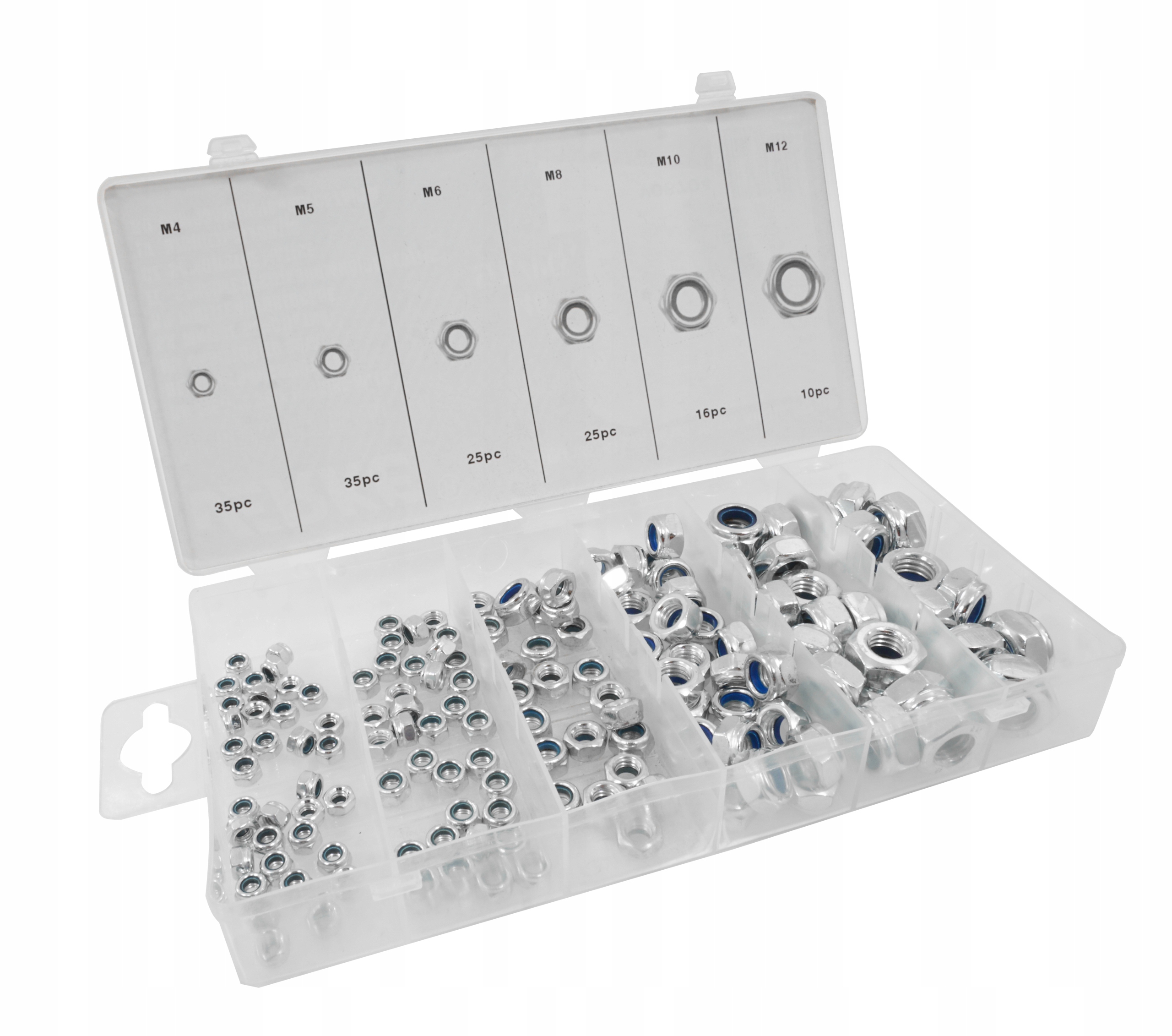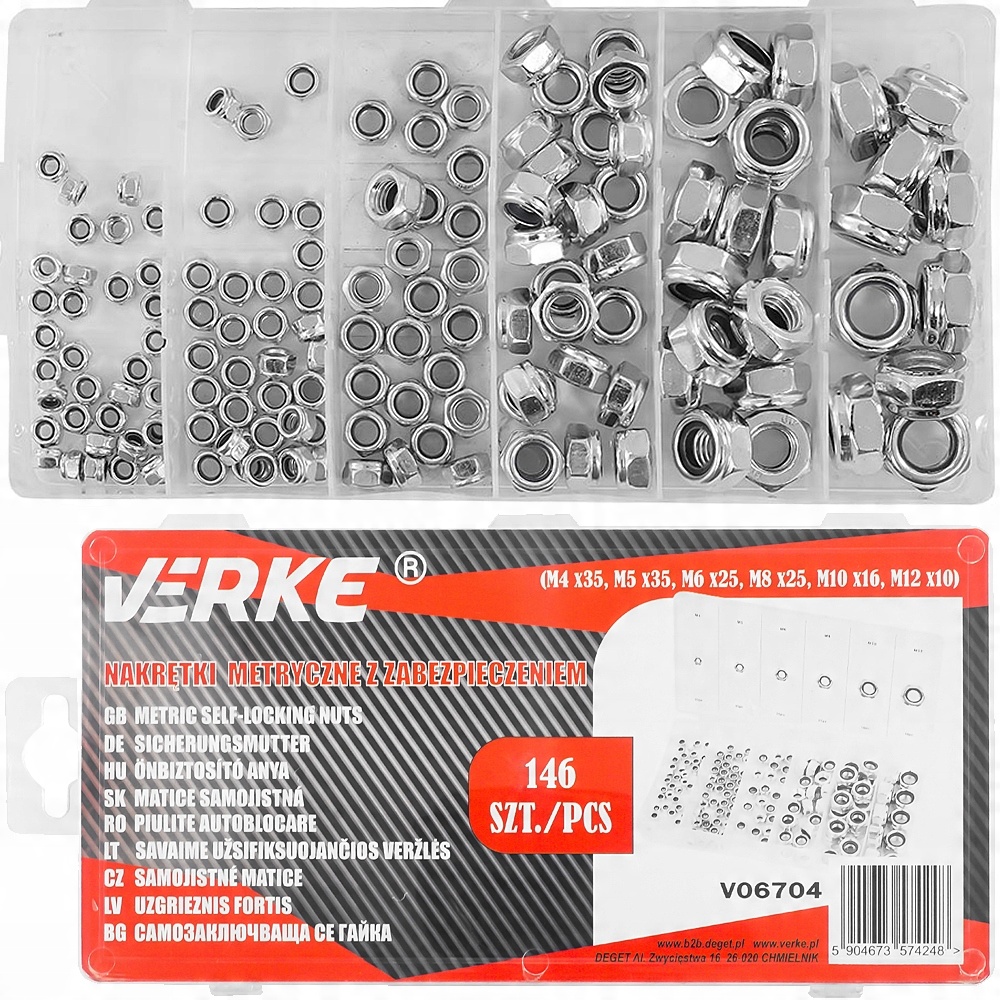 Zestaw 146 sztuk nakrętek metrycznych z zabezpieczeniem przeciw samoistnemu odkręcaniu się. W zestawie znajdują się rozmiary: M4, M5, M6, M8, M10, M12. Całość umieszczono w wygodnym opakowaniu typu “sortownik”.