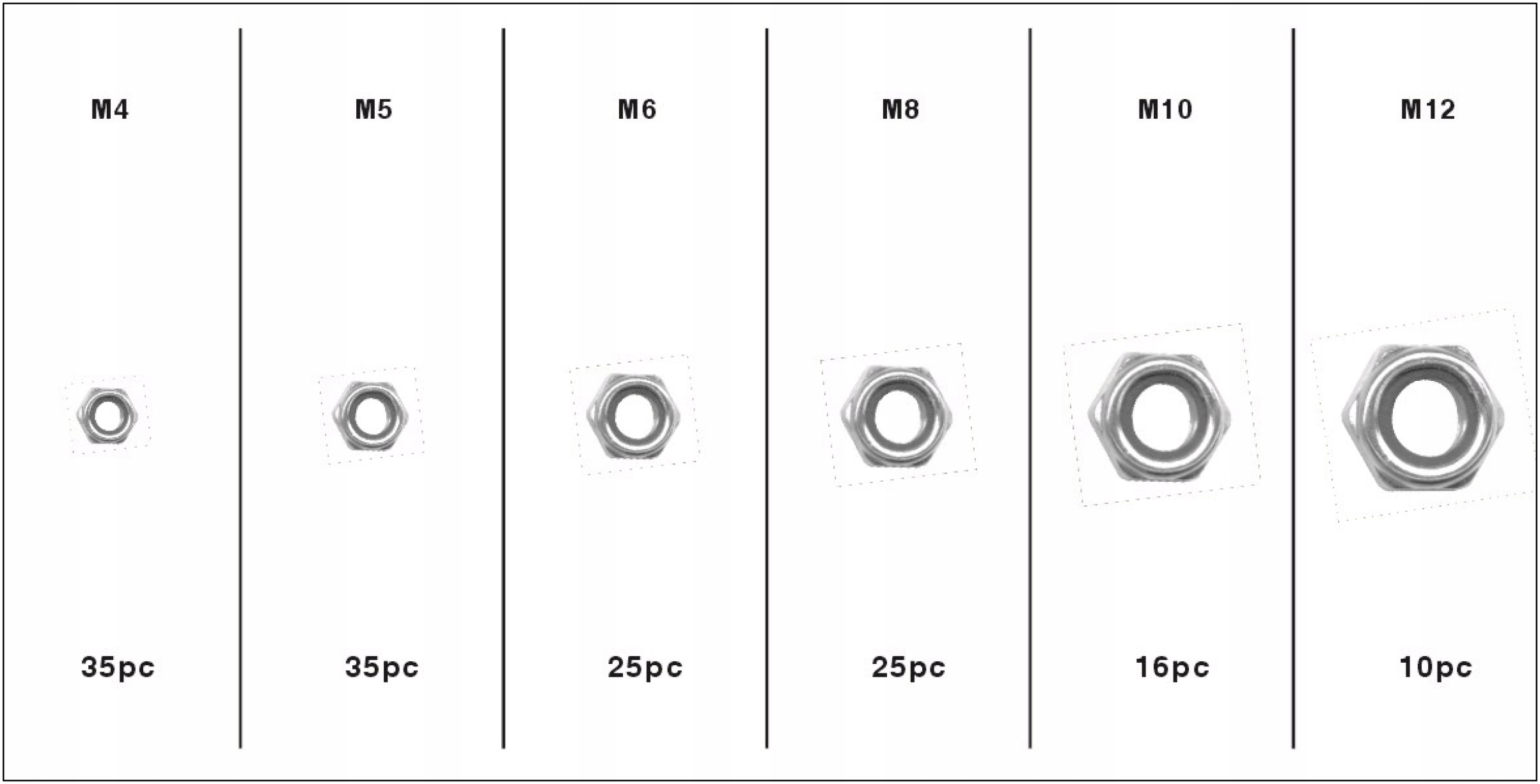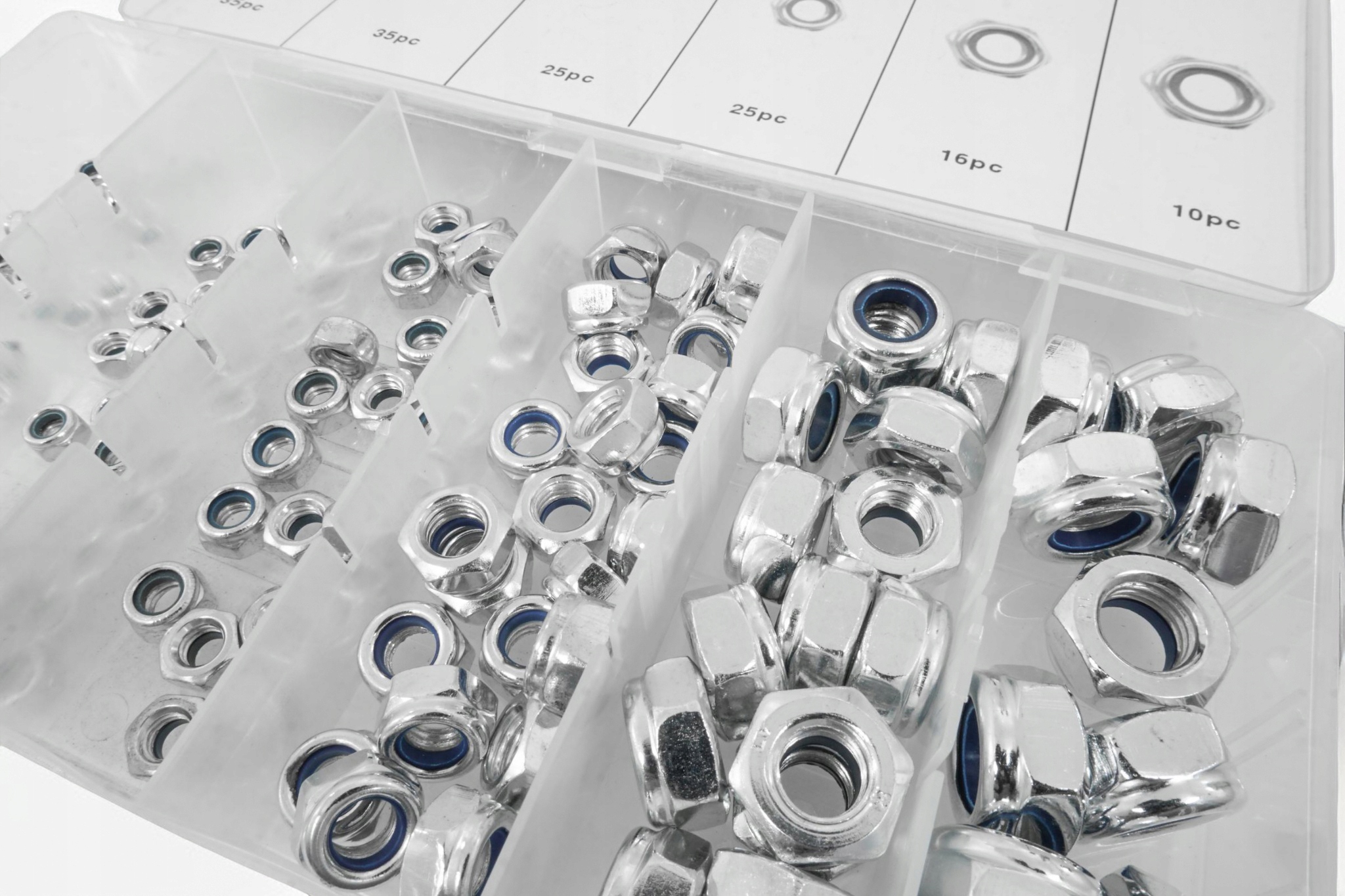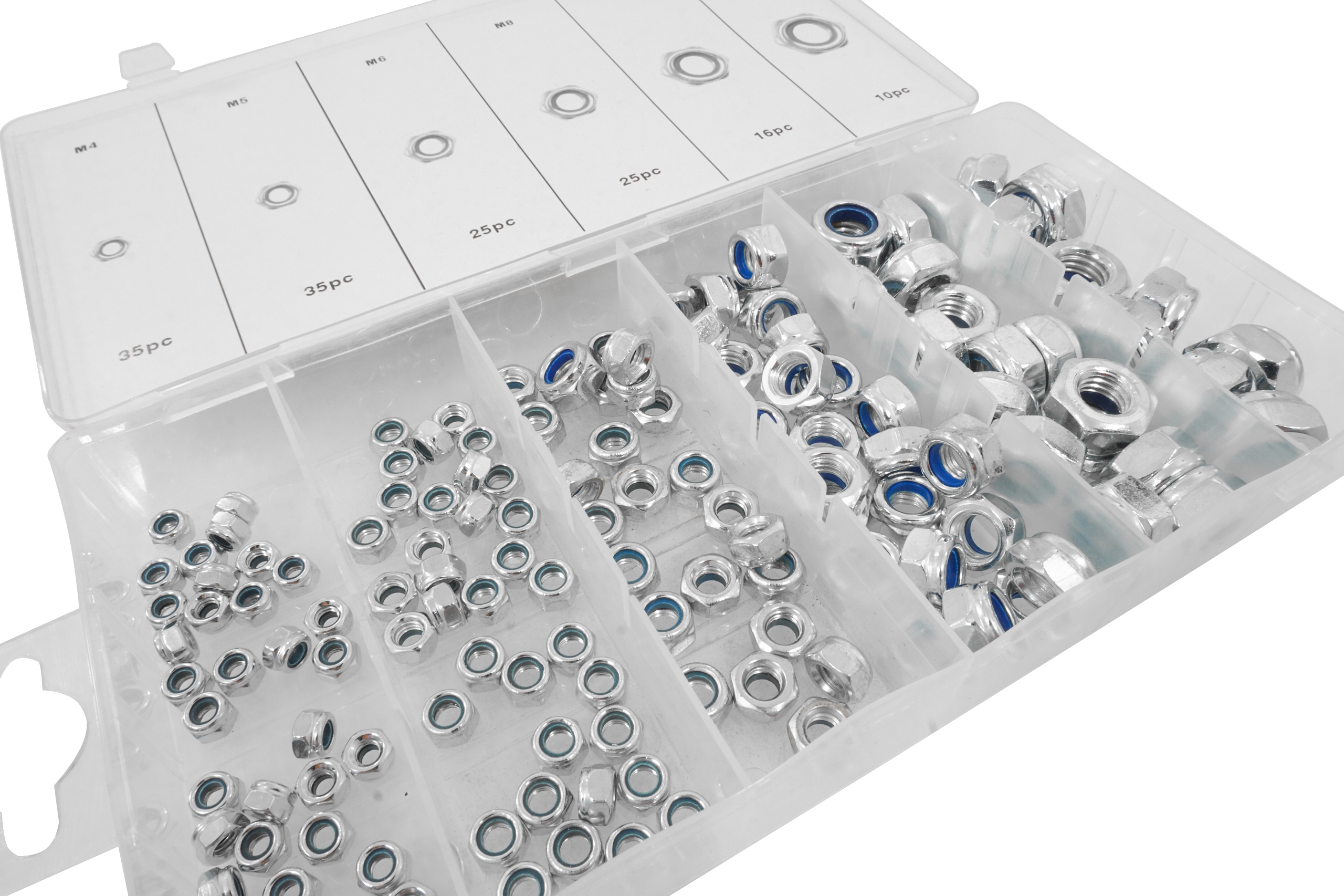 Zestaw 146 sztuk nakrętek metrycznych z zabezpieczeniem przeciw samoistnemu odkręcaniu się. W zestawie znajdują się rozmiary: M4, M5, M6, M8, M10, M12. Całość umieszczono w wygodnym opakowaniu typu “sortownik”.
