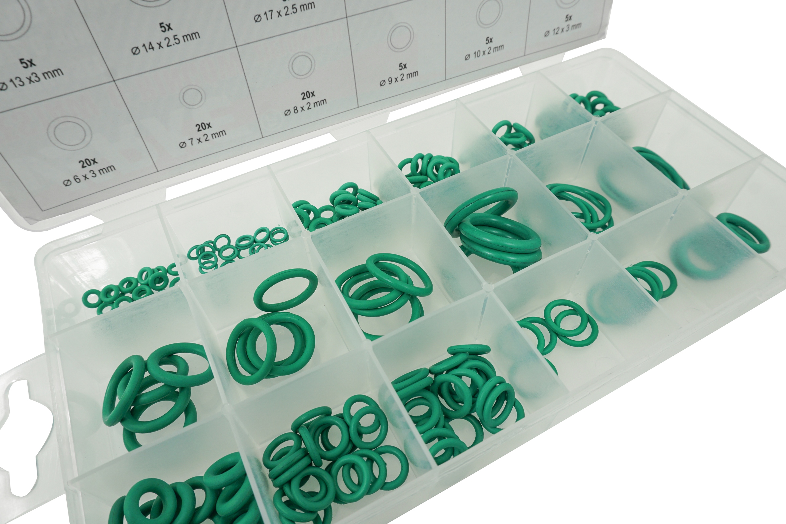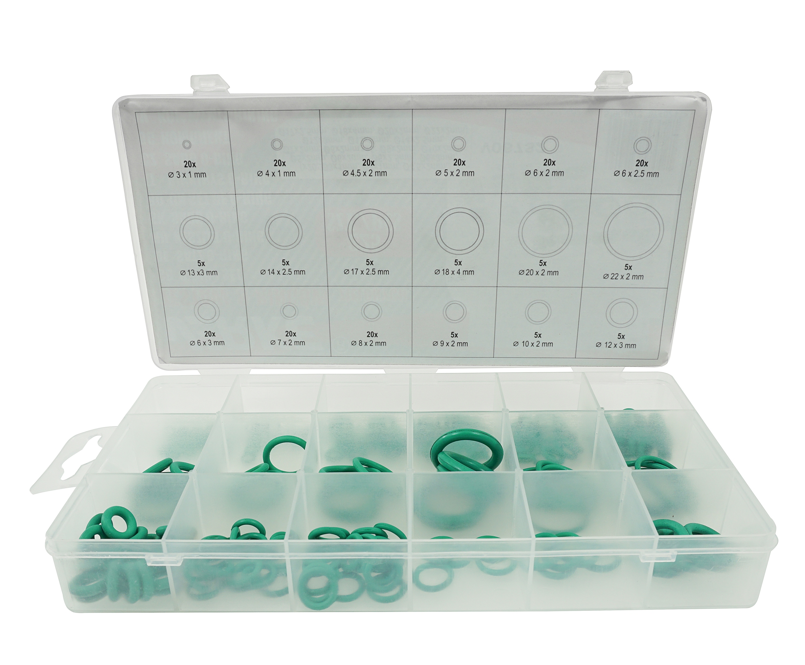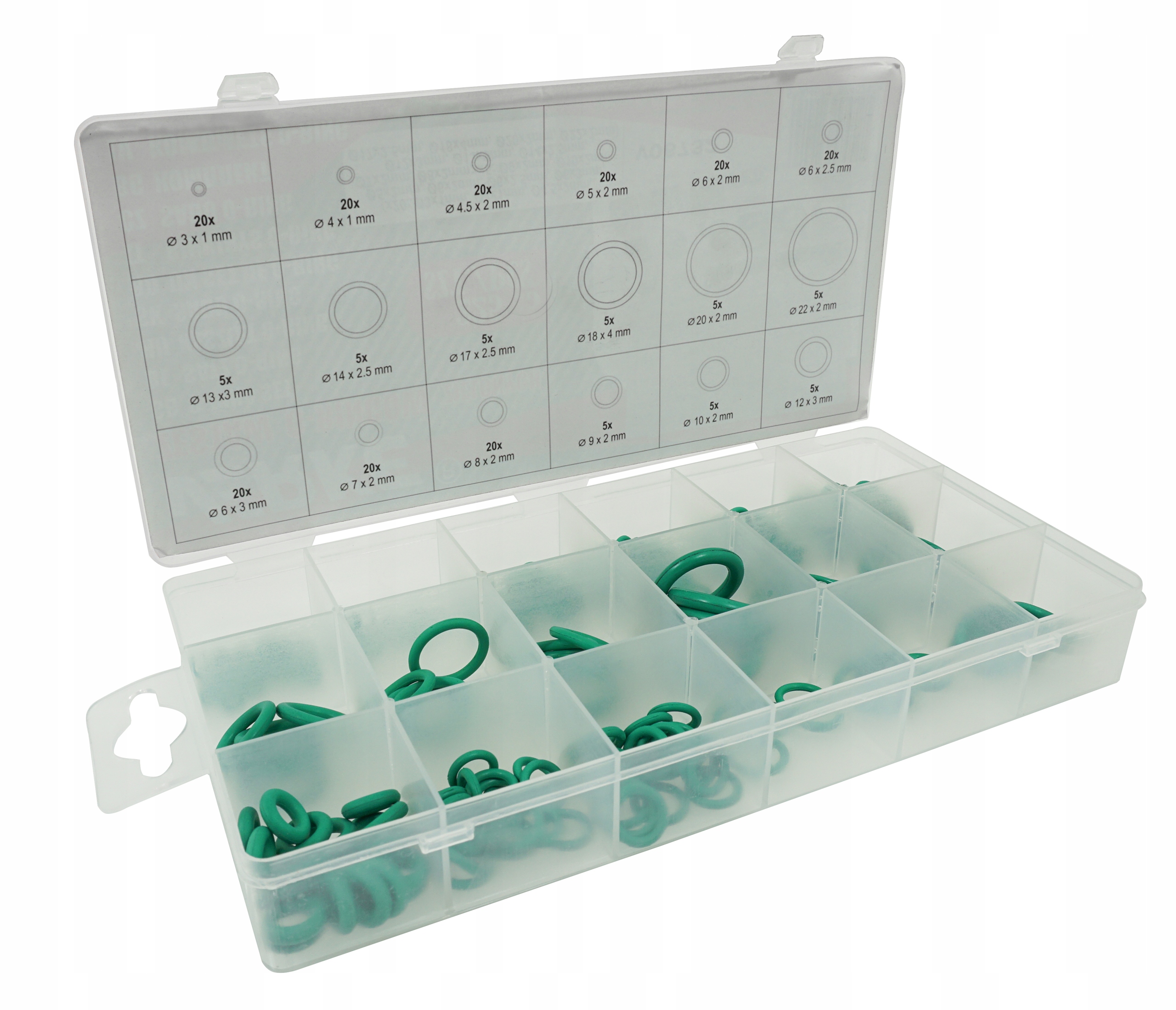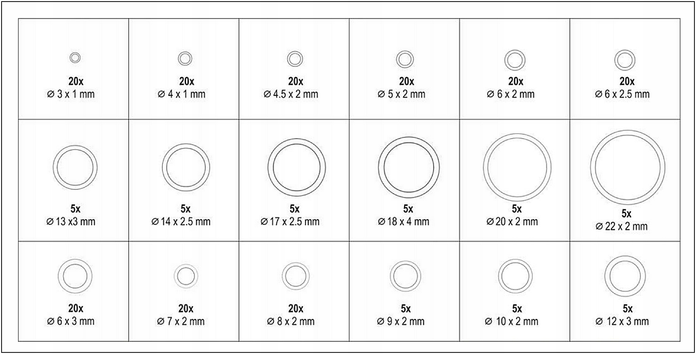Praktyczny zestaw 25 O-ringów zawiera mix rozmiarów. O-ringi wykonane zostały z kauczuku HNBR. Praktyczne opakowanie pozwala na łatwy dostęp do dogodnego rozmiaru.