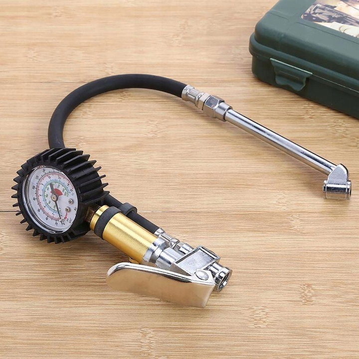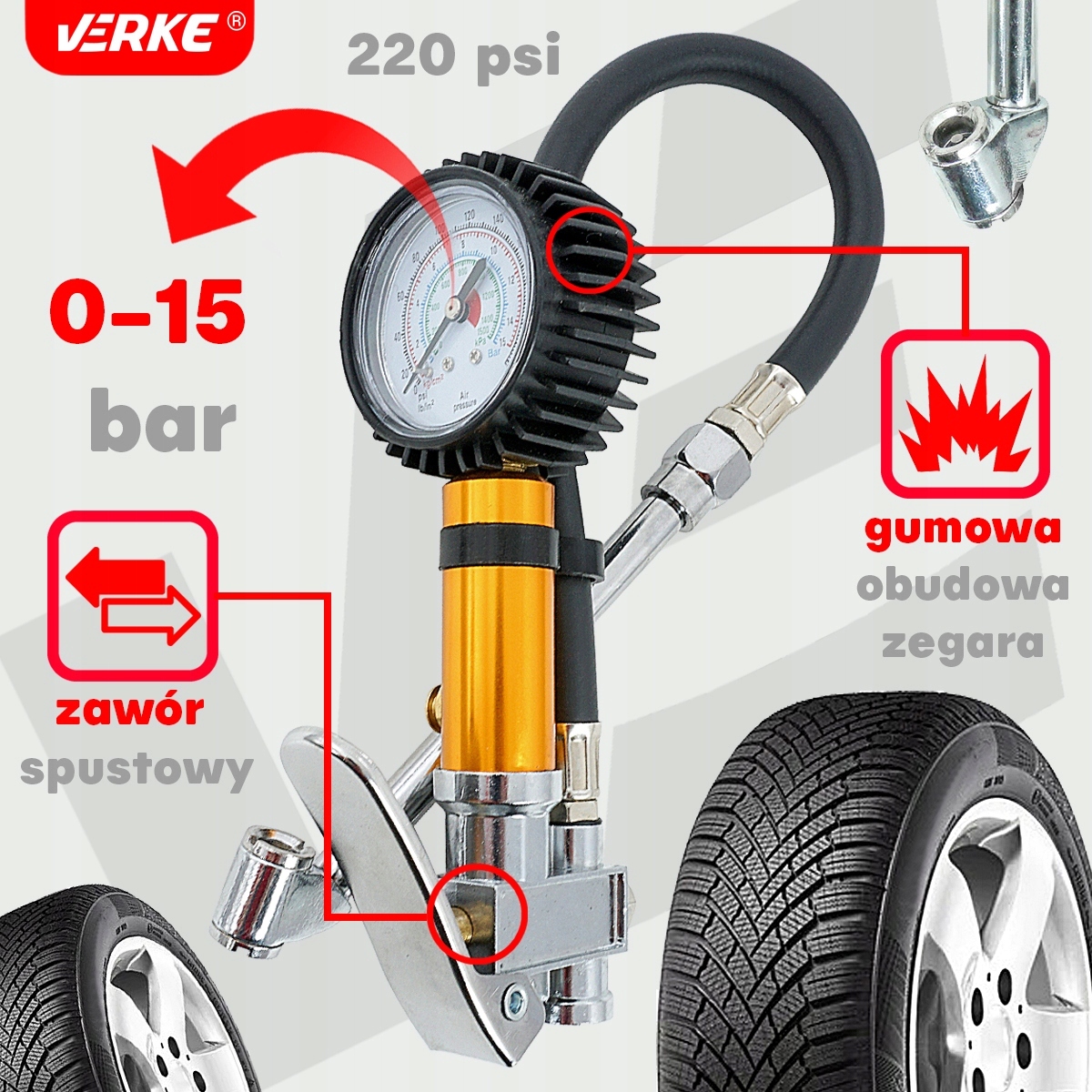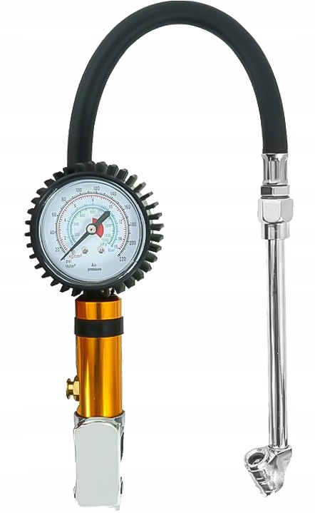 Pistolet do pompowania z manometrem służy do pompowania i kontroli ciśnienia ogumienia pneumatycznego. Posiada gumową obudowę zegara. Wyposażony jest w zawór spustowy powietrza.