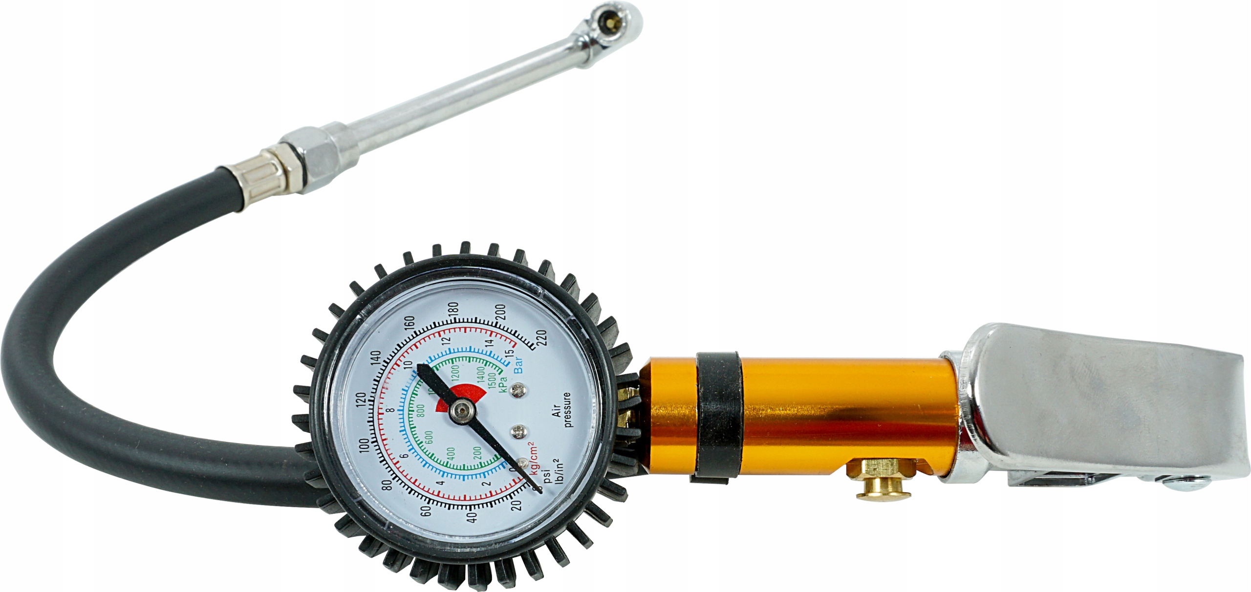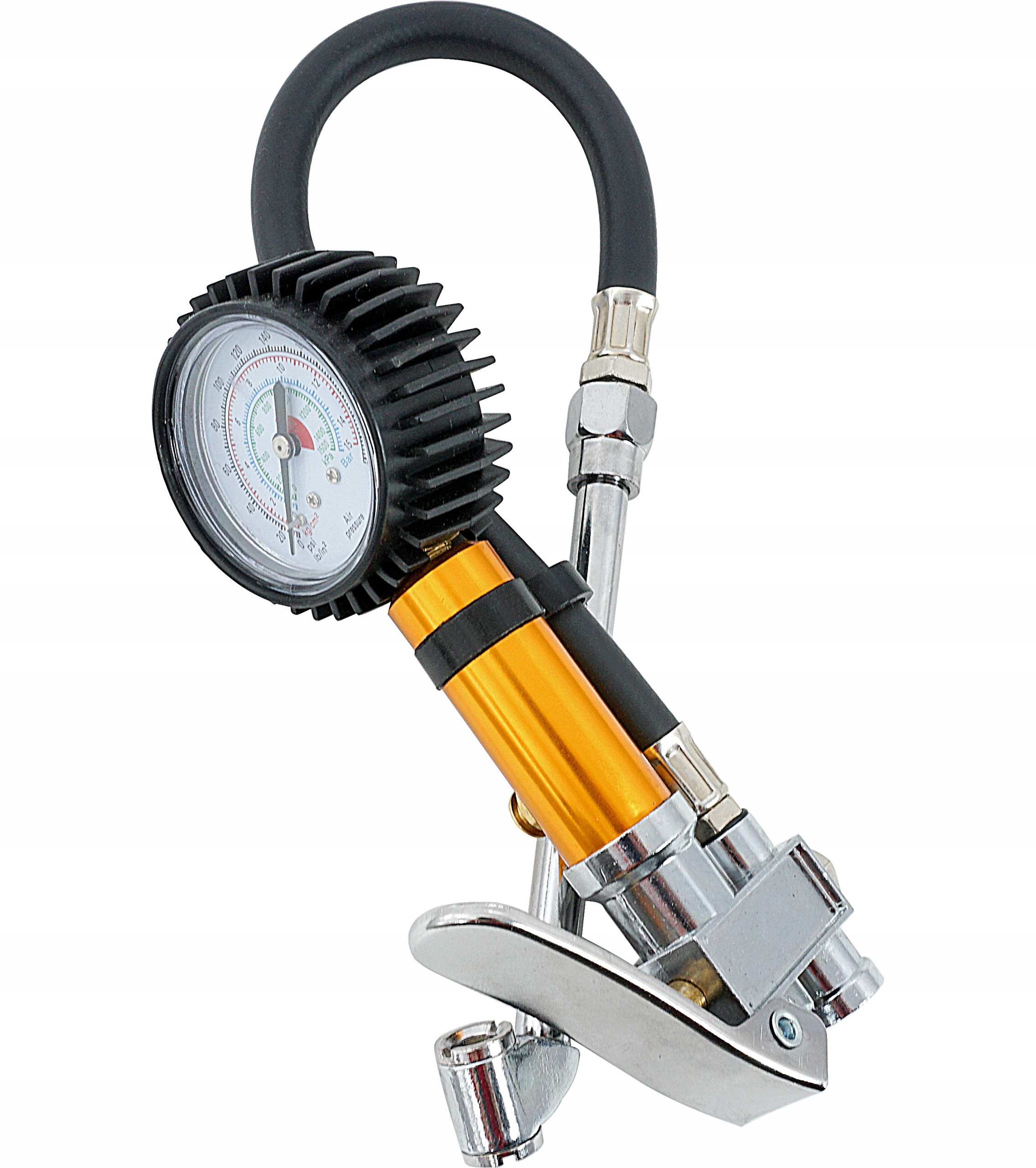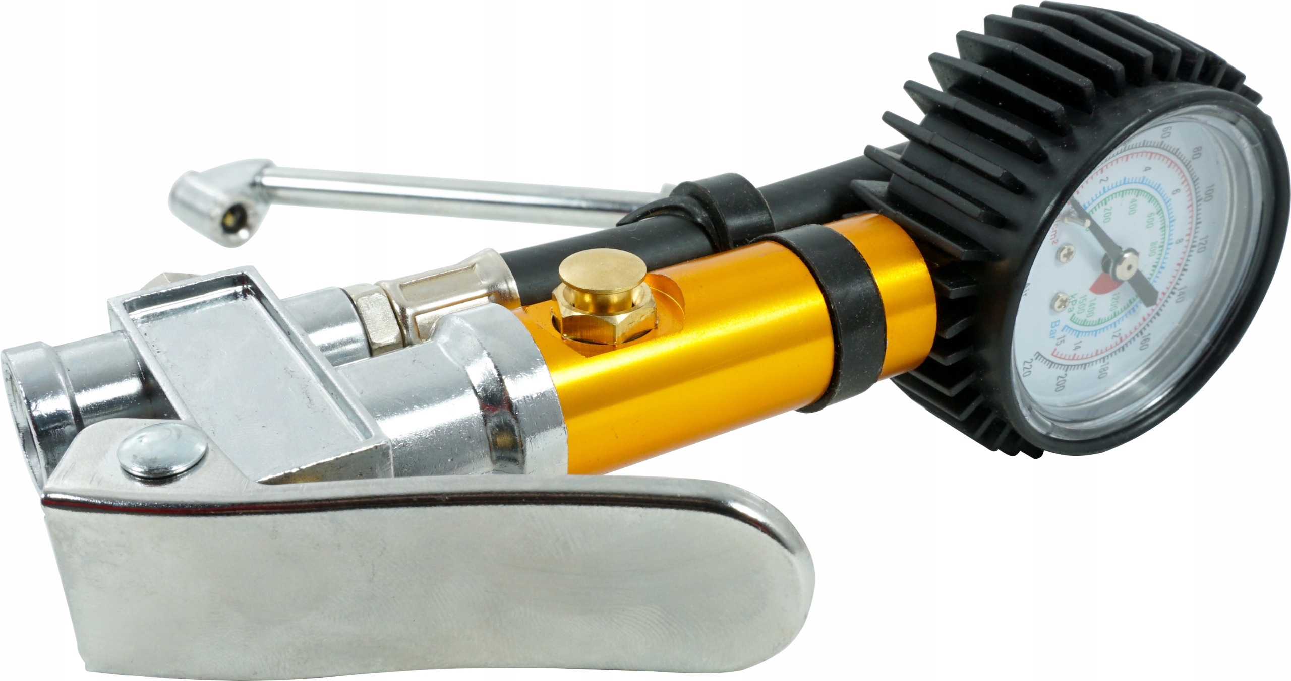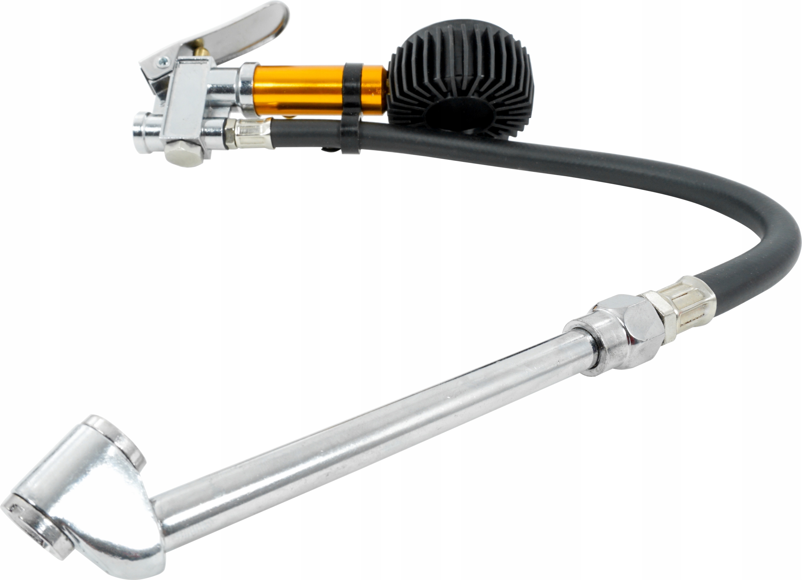 Pistolet do pompowania z manometrem służy do pompowania i kontroli ciśnienia ogumienia pneumatycznego. Posiada gumową obudowę zegara. Wyposażony jest w zawór spustowy powietrza.