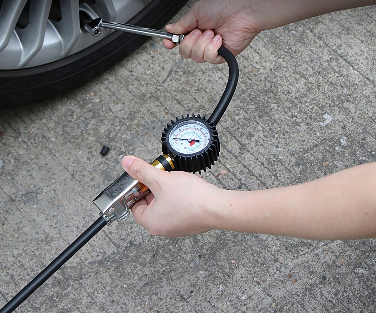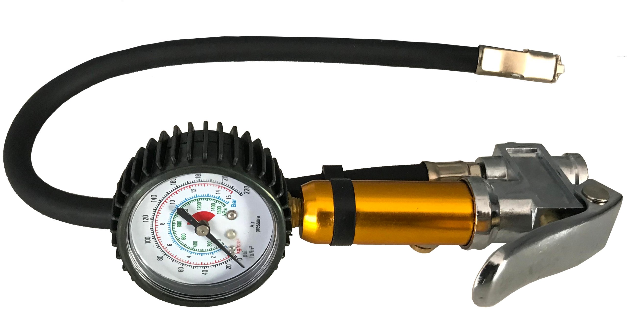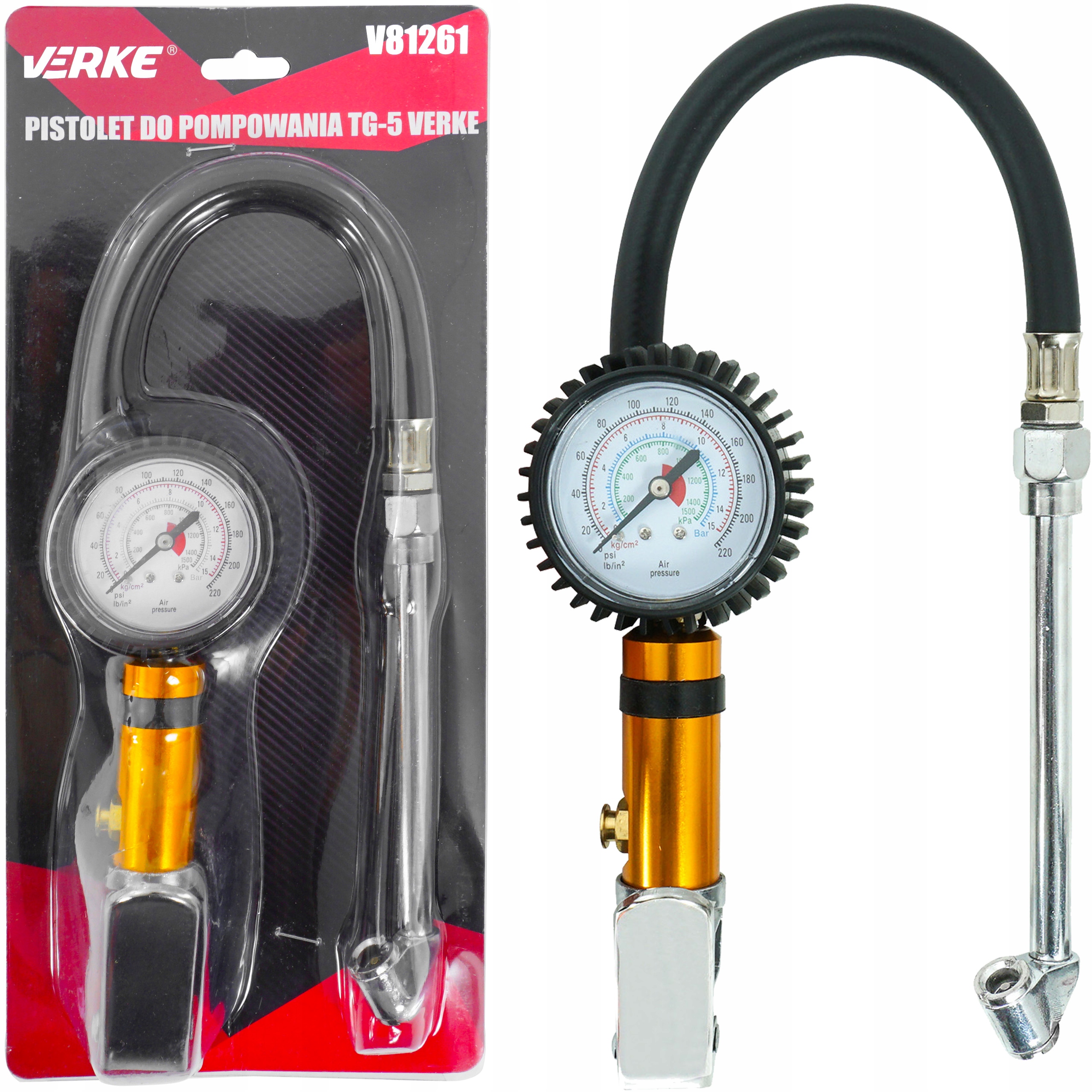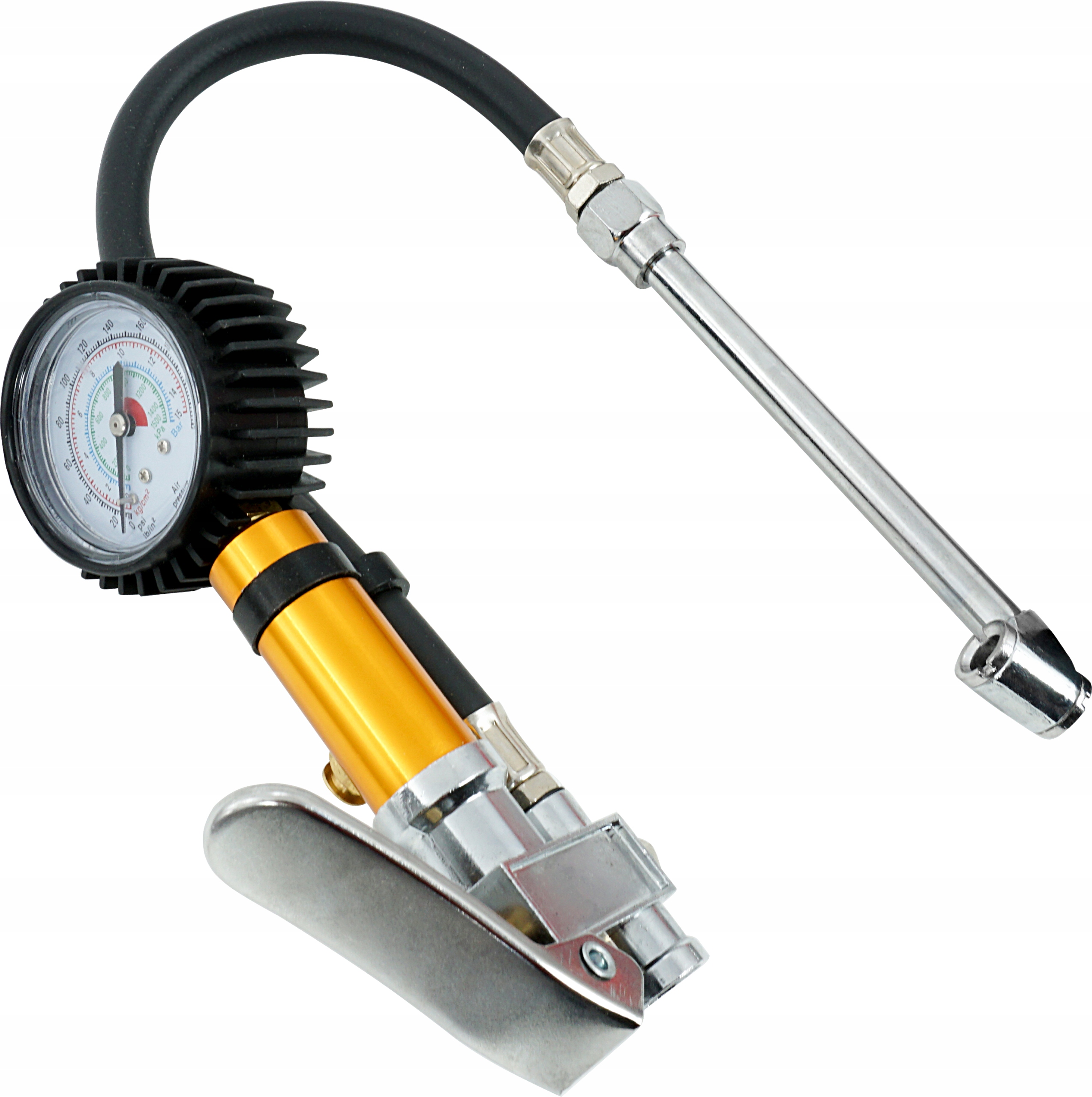 Pistolet do pompowania z manometrem służy do pompowania i kontroli ciśnienia ogumienia pneumatycznego. Posiada gumową obudowę zegara. Wyposażony jest w zawór spustowy powietrza.