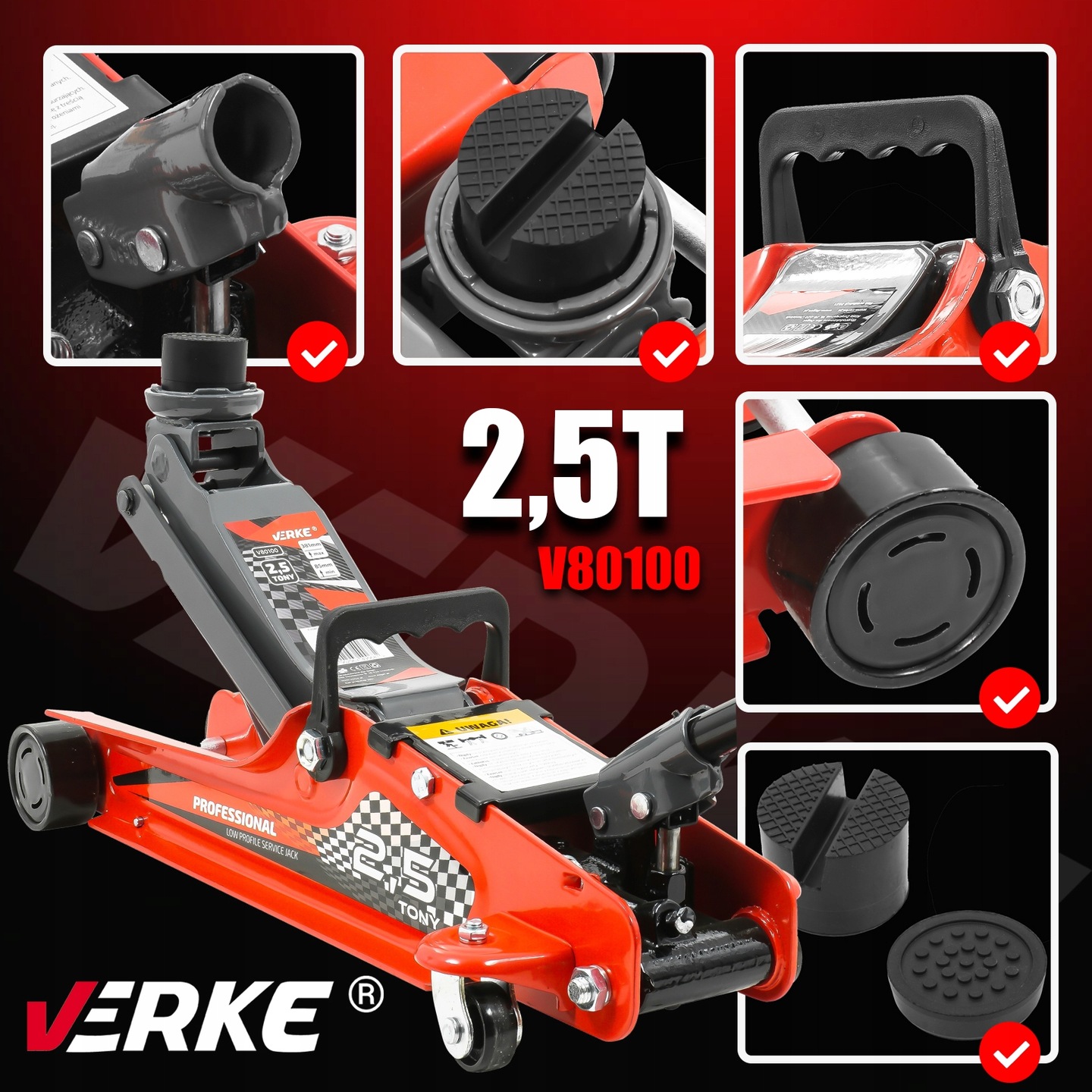 Podnośnik samochodowy firmy VERKE®. Posiada konstrukcję opartą o zasadę dźwignika ramieniowego z napędem hydraulicznym działającym w osi poziomej. Cechą charakterystyczną podnośnika jest jego niewielka wysokość początkowa, dzięki czemu można wsunąć podnośnik pod każde auto, szczególnie przydatne przy niskich samochodach sportowych. Niezbędny w warsztatach samochodowych, serwisach ogumienia i stacjach obsługi pojazdów.
