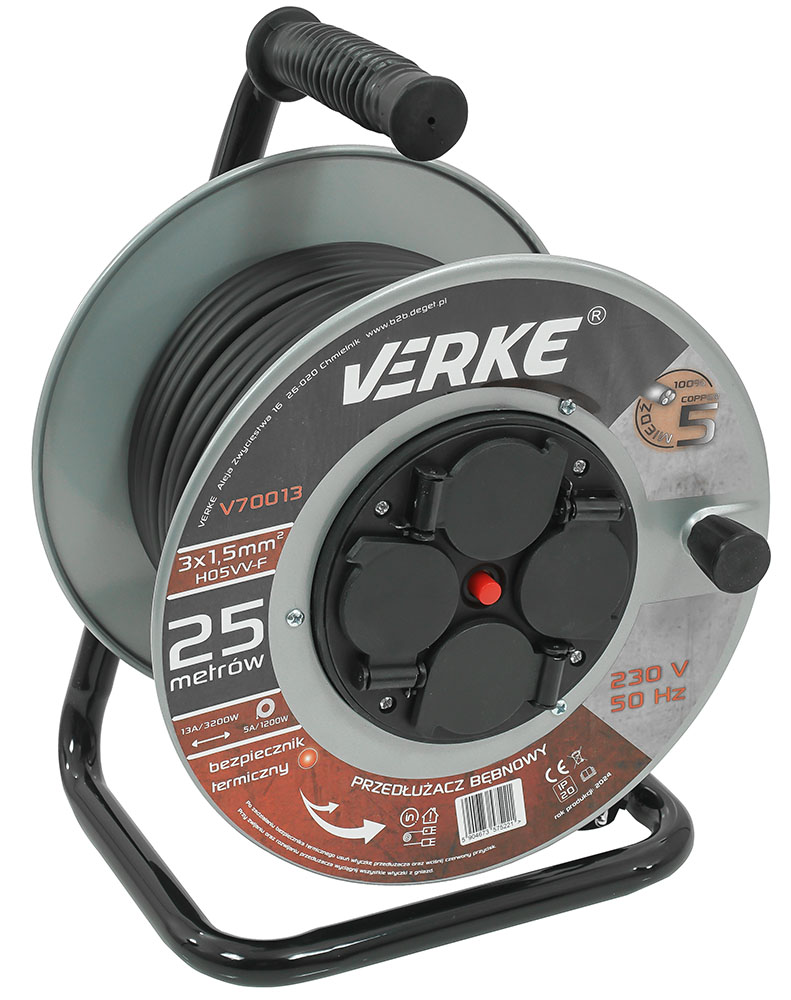 Wysokiej klasy przedłużacz bębnowy o długości 25 m z 4 gniazdami. Przewód wykonany jest z 3 żył miedzianych o przekroju 1,5 mm² każdy. Taki przekrój przewodu umożliwia podłączenie do tych przedłużaczy jednocześnie 4 urządzeń, co jest szczególnie przydatne na budowie czy w warsztacie. Przewody pokryte są izolacją z polwinitu, która charakteryzuje się wysoką odpornością na uszkodzenia mechaniczne, czynniki atmosferyczne, substancje chemiczne. Przedłużacz został wyposażony w bezpiecznik termiczny.