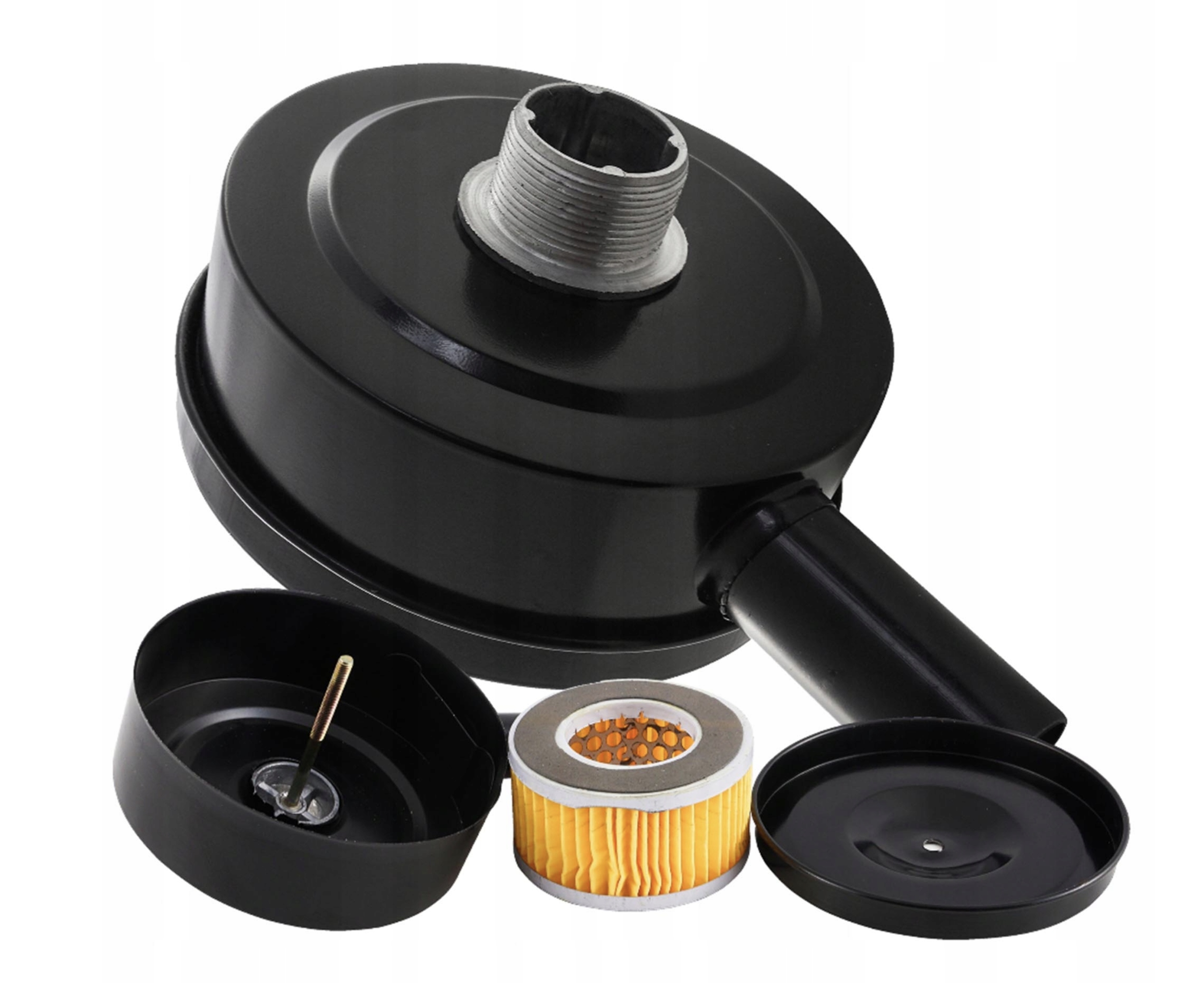 Sprężarka wyposażona w dwa papierowe filtry w metalowej obudowie.