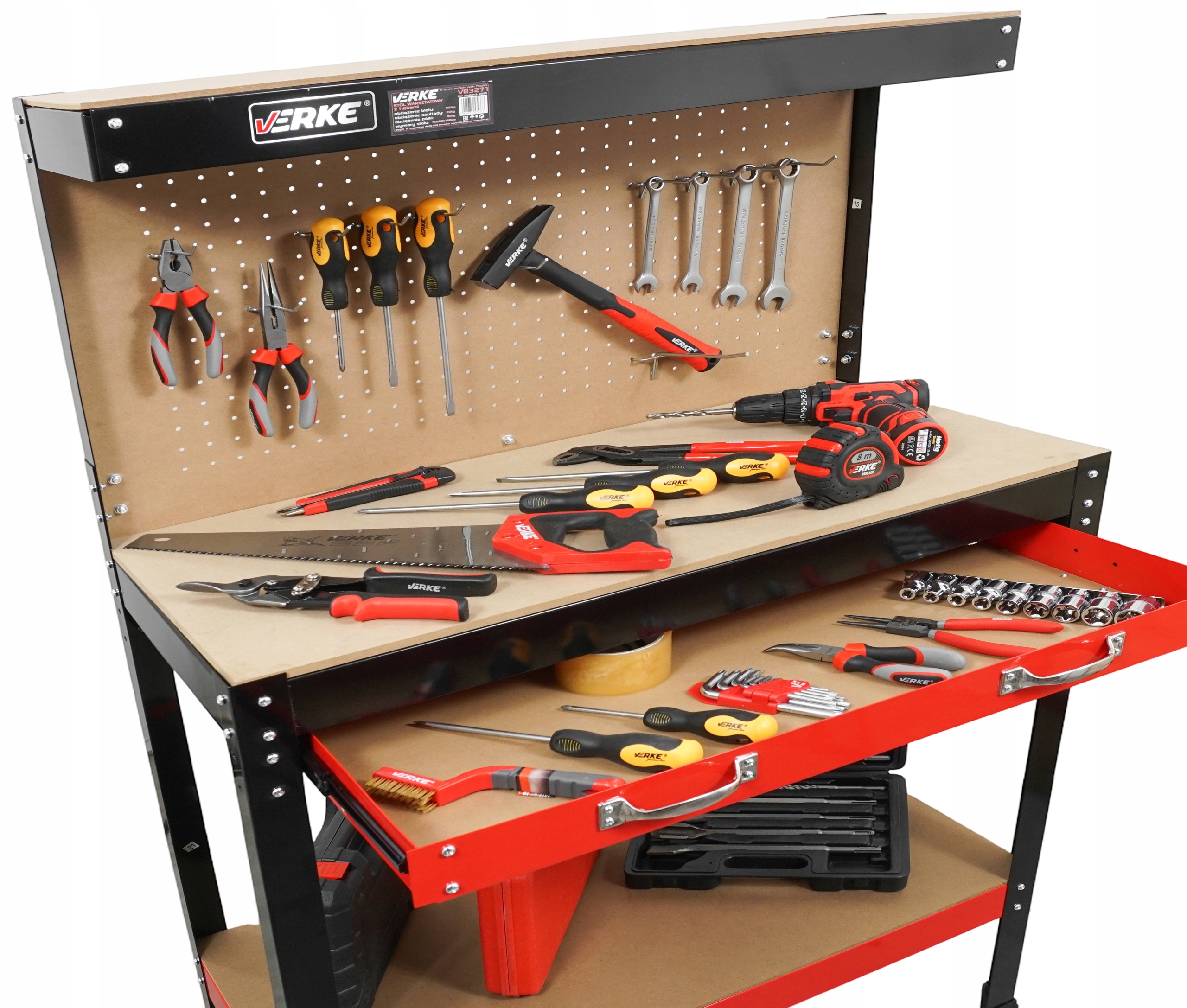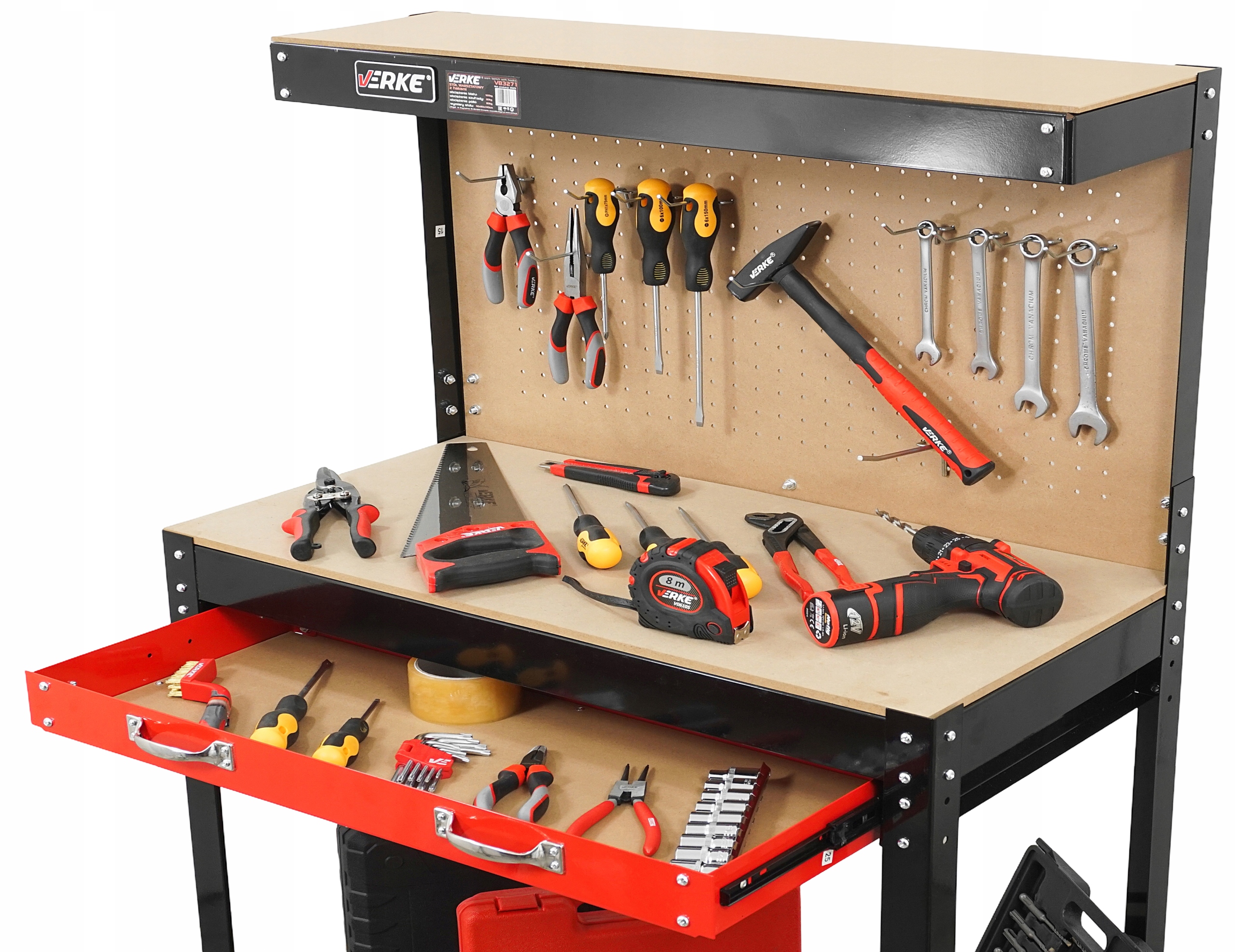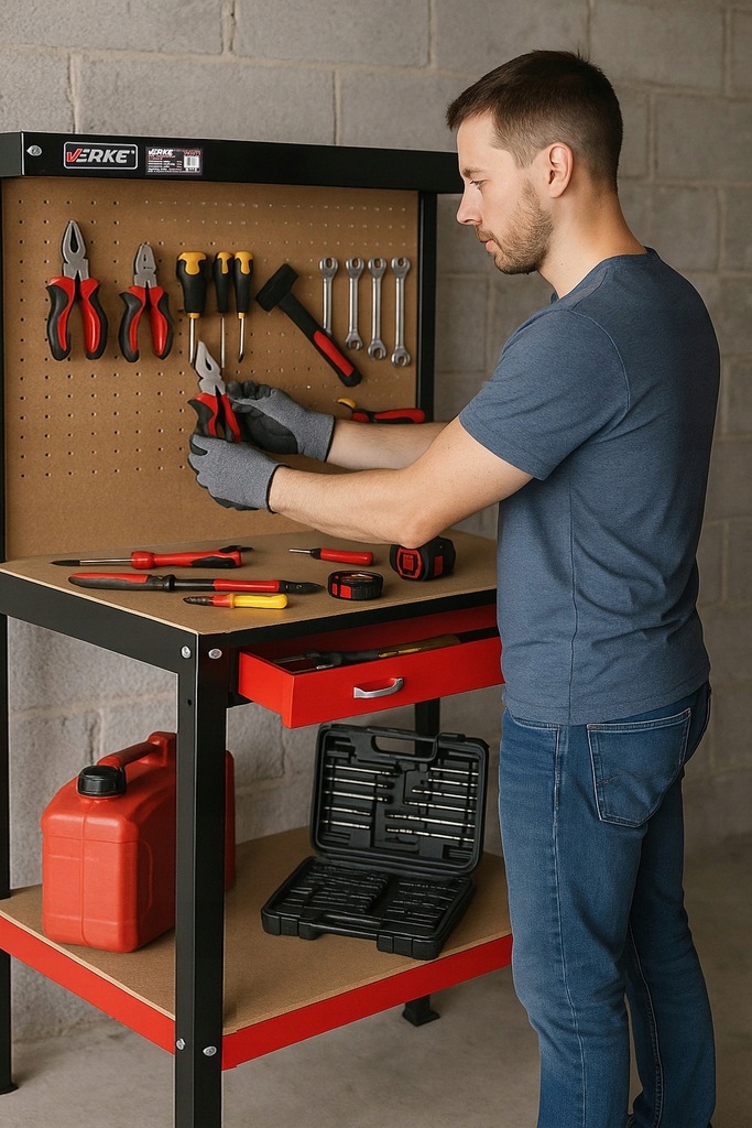 Dzięki przemyślanej konstrukcji i dodatkom, takim jak perforowana tablica, wszystkie narzędzia są zawsze na swoim miejscu, co ułatwia pracę i poprawia efektywność.