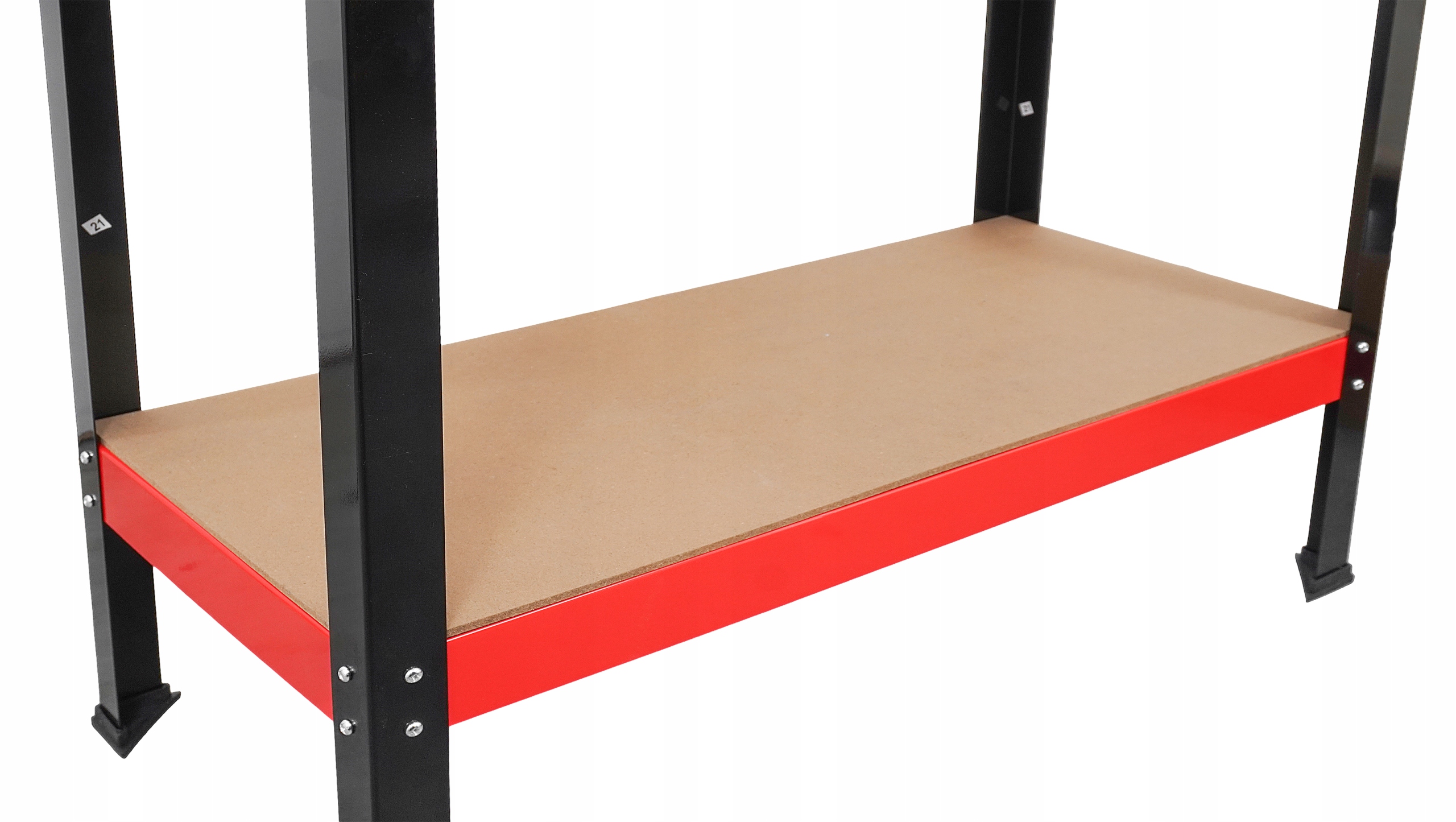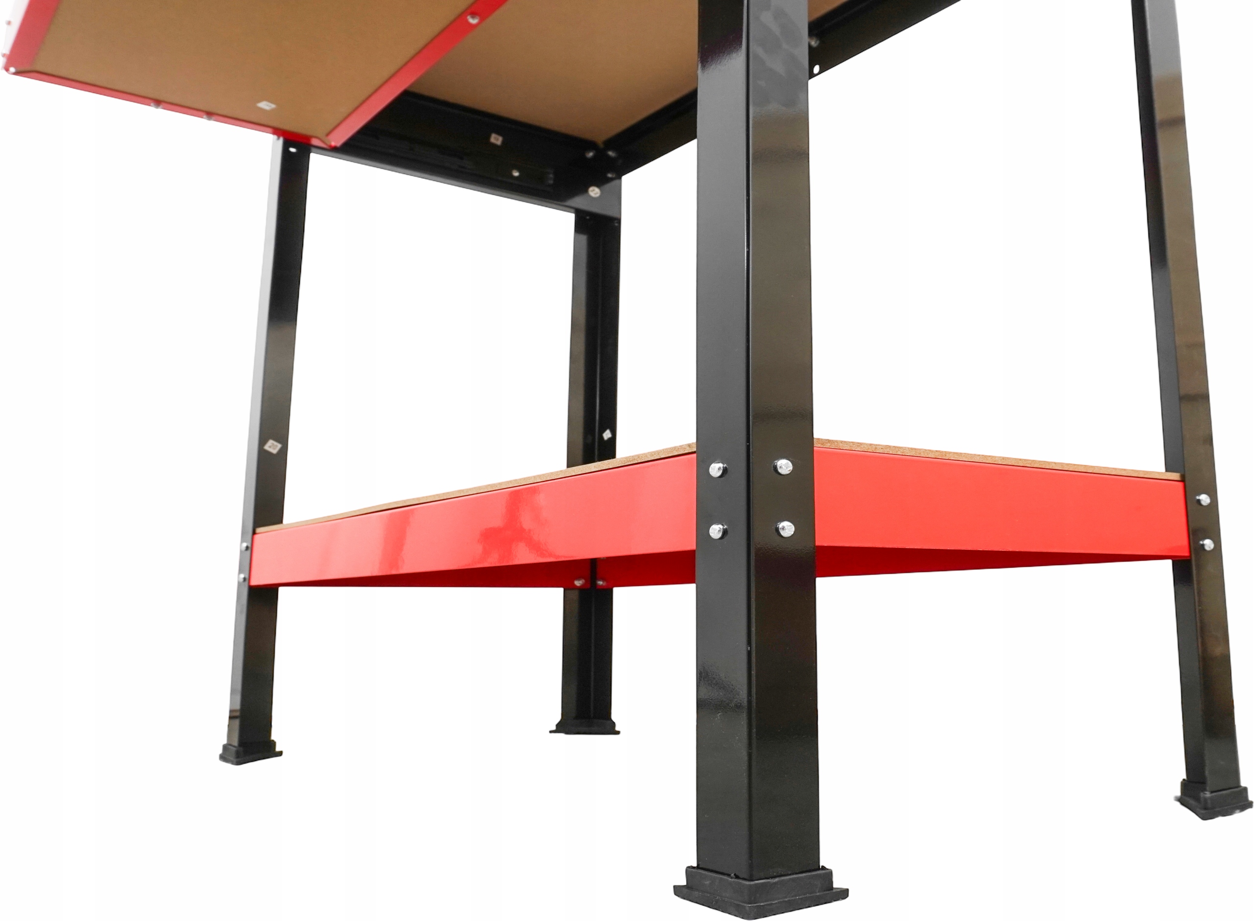 Stół wykonany ze stali malowanej proszkowo i płyt MDF. Model posiada dodatkowe wsporniki, dzięki czemu udźwig blatu roboczego wynosi do 100 kg, co zapewnia stabilność i bezpieczeństwo nawet przy ciężkich pracach.