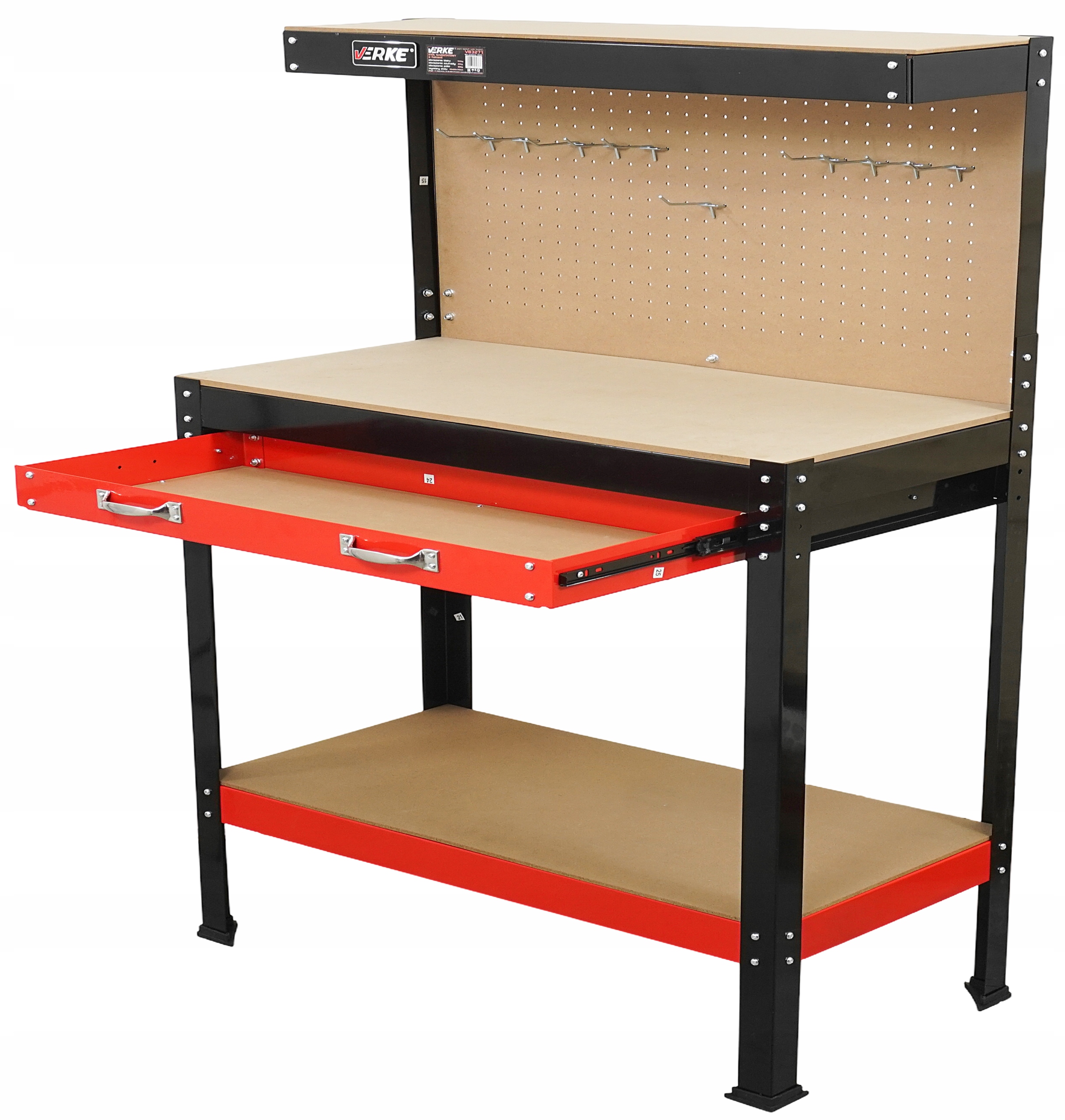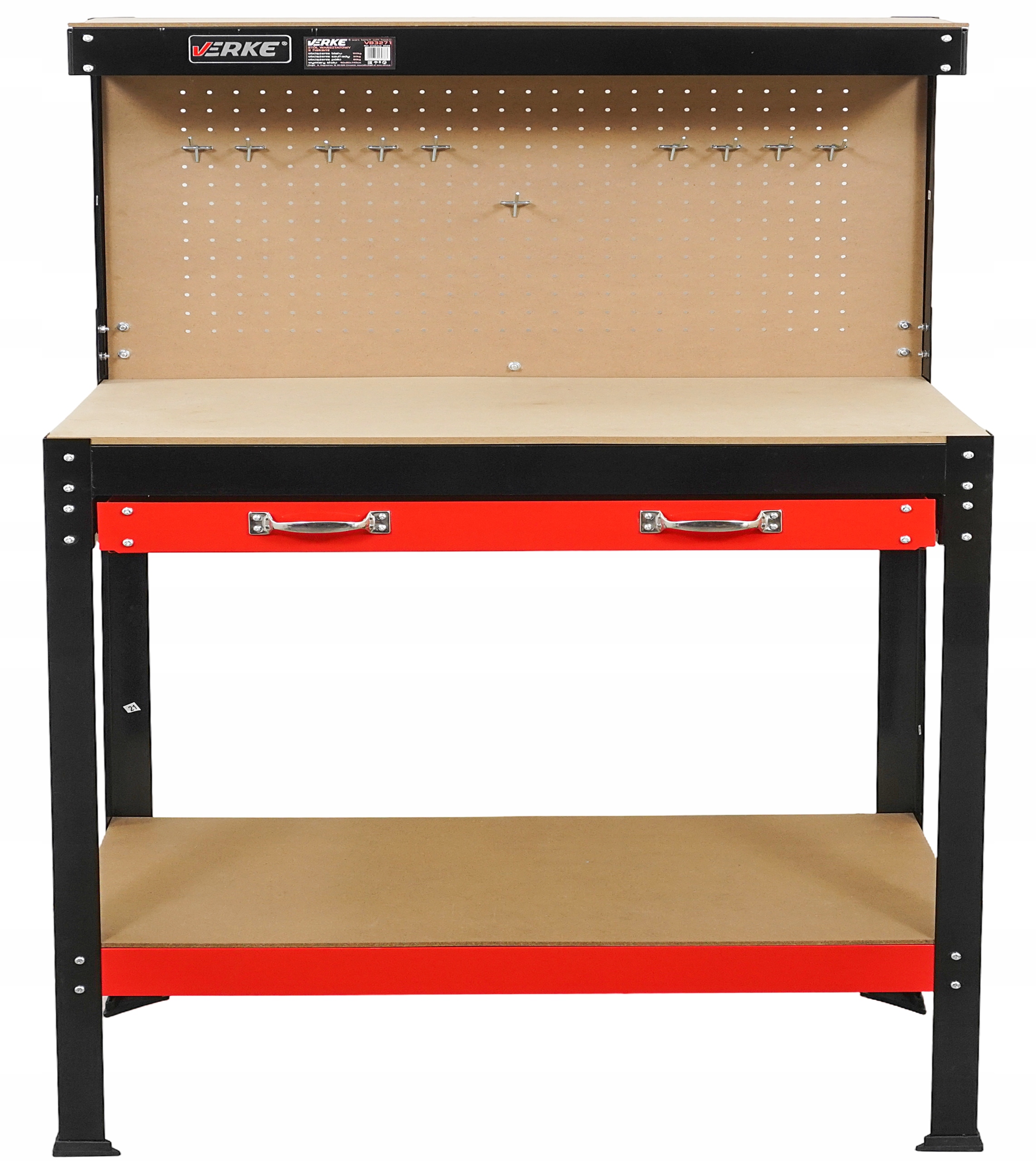 Dolna i górna półka oraz dodatkowa perforowana tablica na narzędzia z 10 haczykami umożliwiają dowolną aranżację i utrzymanie porządku w warsztacie. Maksymalne obciążenie tablicy to 20 kg.