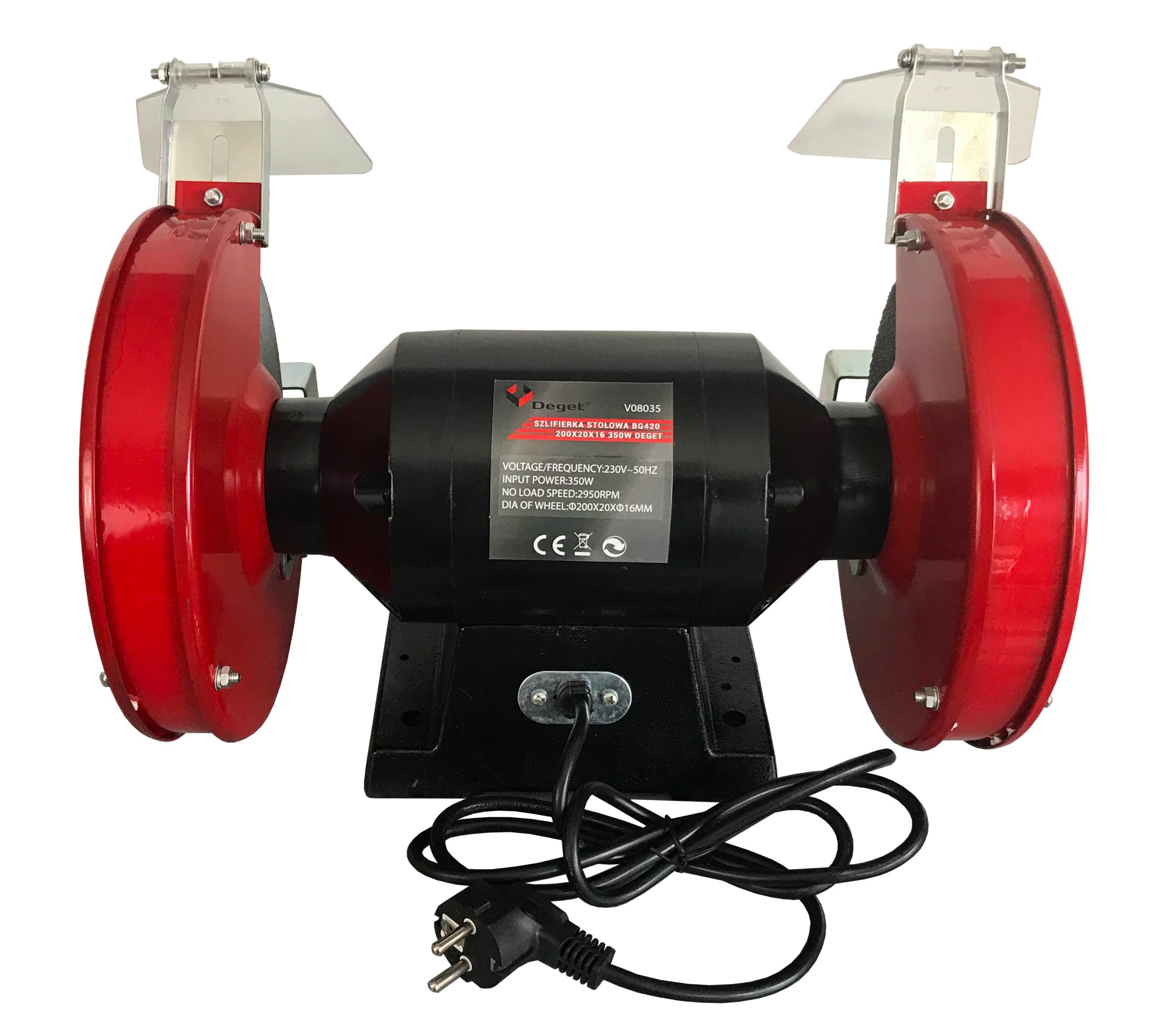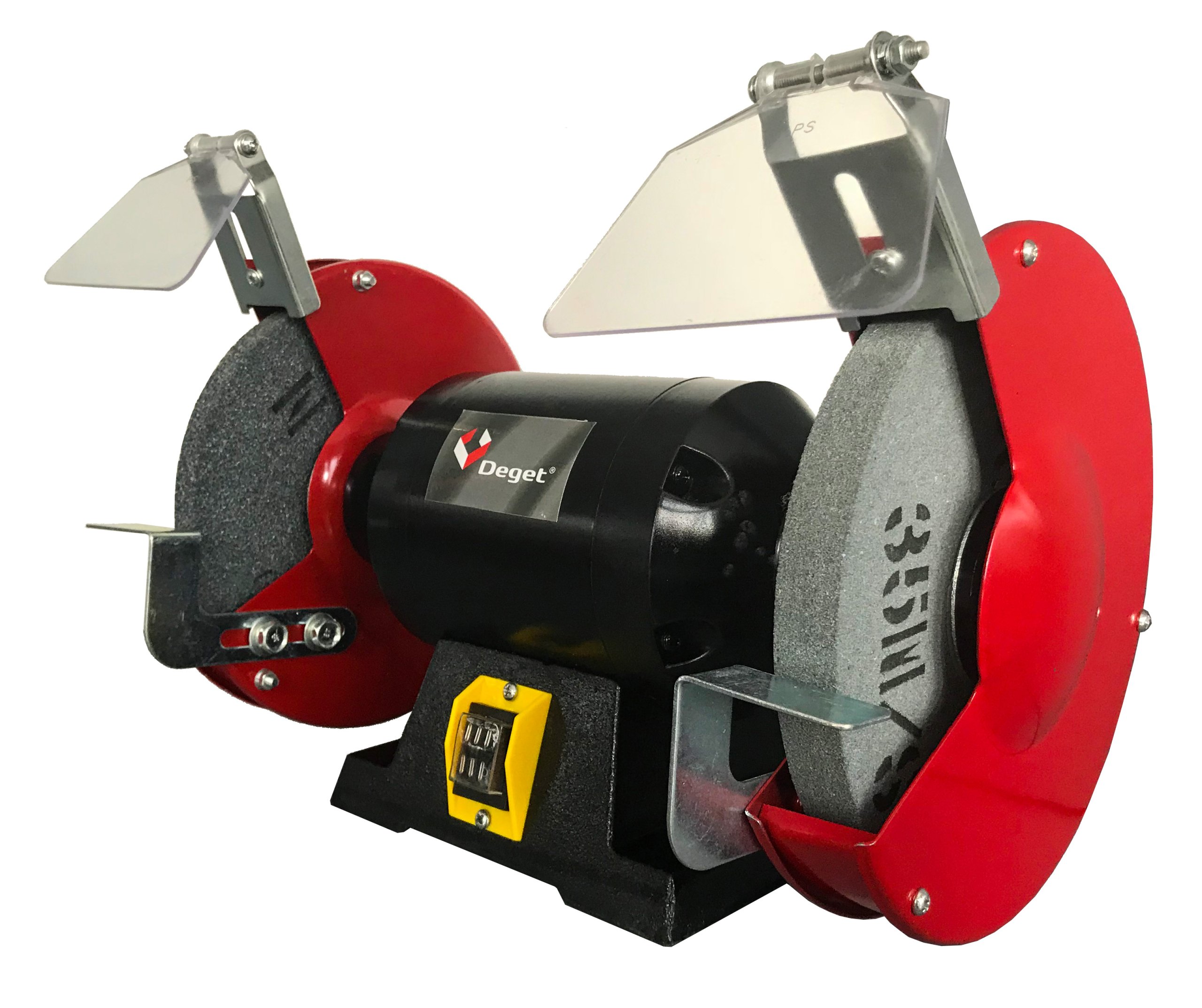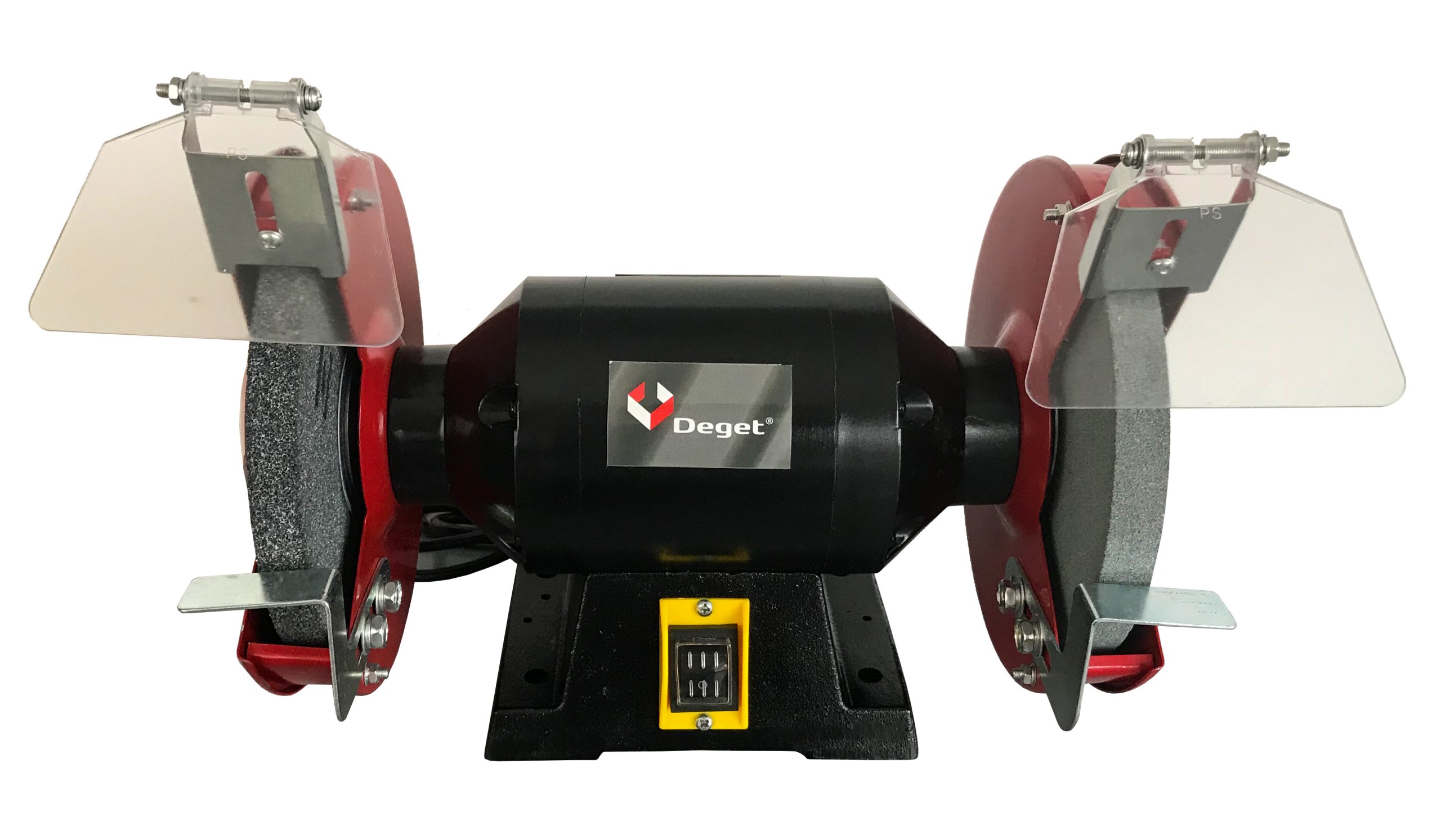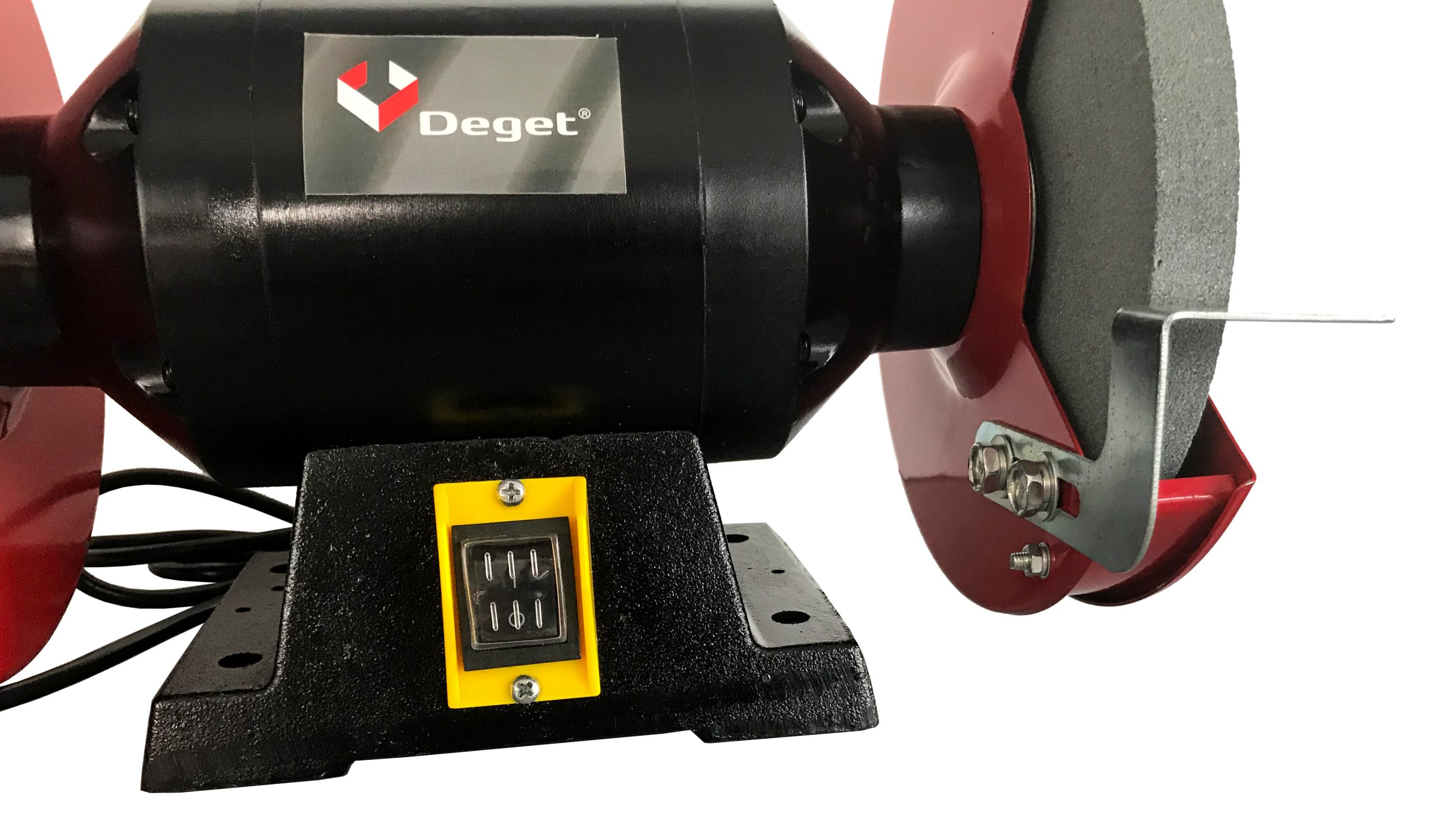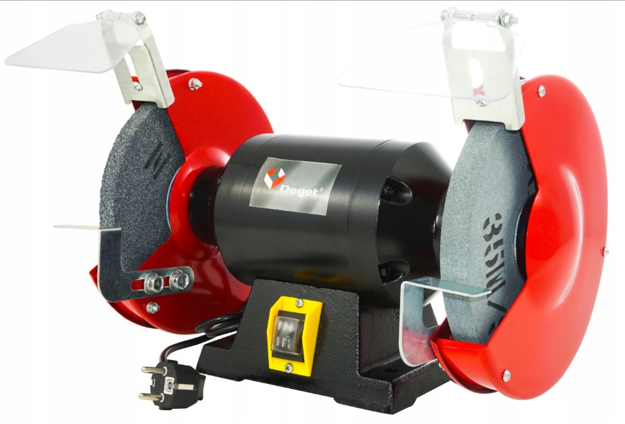 Wysokiej jakości szlifierka do ostrzenia i szlifowania marki DEGET. Szlifierka posiada duże, regulowane ekrany zabezpieczające przed iskrami i odpryskami, a także gumowe stopki, które zapewniają bezpieczne podparcie i tłumią drgania. Osłony wykonane z odlewu metalowego. Włącznik zabezpieczony przed wnikaniem pyłu. Łagodny rozruch zapewnia pełną kontrolę podczas pracy. Idealnie spisuje się w warsztatach mechanicznych i ślusarskich.