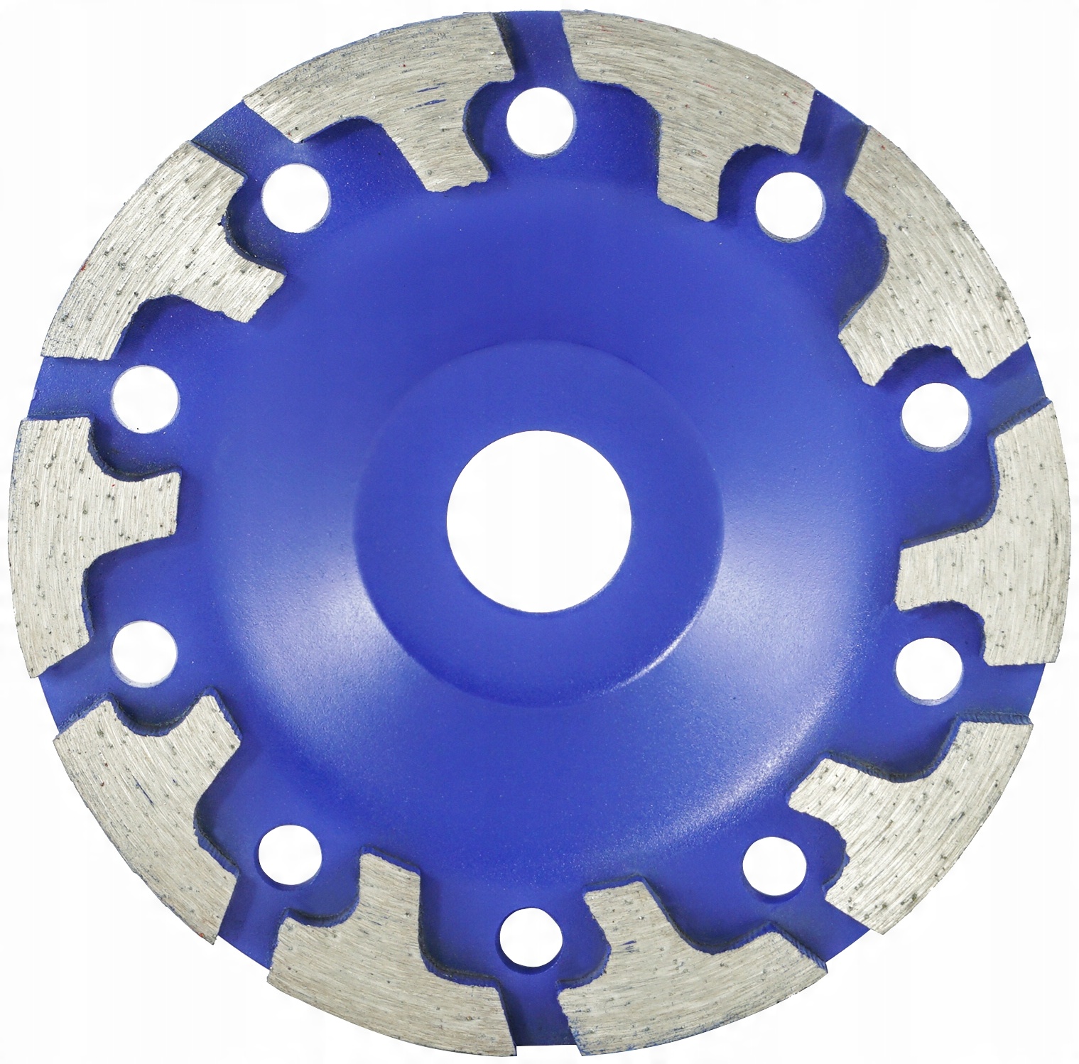 Tarcza diamentowa T-shape do szlifowania twardych materiałów budowlanych. Posiada wyjątkowo duża koncentrację wysokiej jakości diamentu. Tarcza zapewnia wysokiej klasy szlifowanie podczas całego czasu jej pracy. Cechu te polepszają jakość szlifowania i żywotność tarcz. Zastosowanie otworów chłodzących znacznie wydłuża żywotność tarczy. Nowoczesne procedury obróbki cieplnej i specjalne wykończenie powierzchni zmniejszają zużycie tarczy oraz poprawiają wytrzymałość. W zestawie otrzymają Państwo o-ring do zmniejszenia średnicy wewnętrznej. Tarcza idealnie nadaje się do: usuwania nierówności formowania oraz szlifowania dużych powierzchni: granitu, marmuru, cegły, klinkieru, kamienia naturalnego oraz sztucznego, betonu zbrojonego, kostki brukowej. Przeznaczona do pracy na sucho.