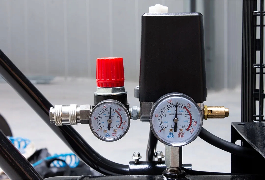 Łatwe sterowanie – wyłącznik ciśnieniowy Start/Stop, regulator ciśnienia i szybkozłącze zapewniają pełną kontrolę nad pracą urządzenia.