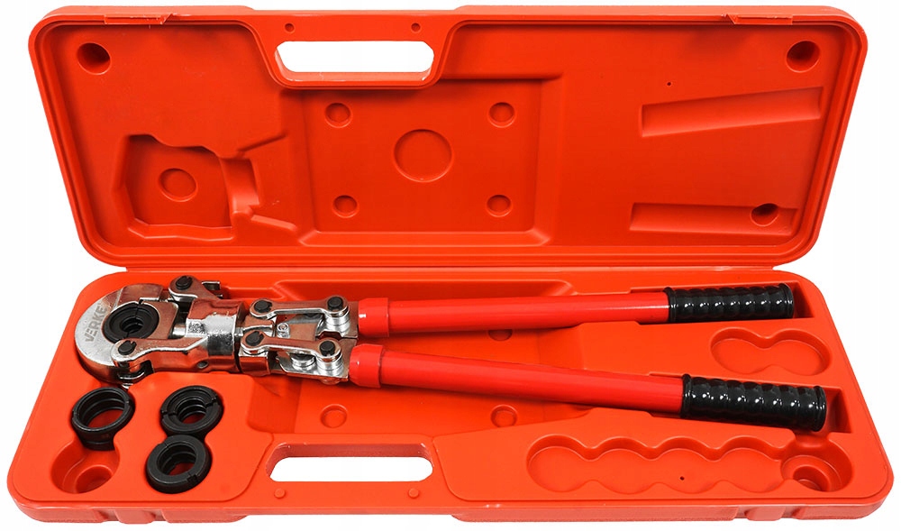 Ręczna praska hydrauliczna do zaciskania złączek na rurach PEX z zestawem 4 matryc. Zaciskarka wyposażona jest w siłownik hydrauliczny pozwalający precyzyjnie i szczelnie zacisnąć złączki z siłą 60 kN. Głowica obrotowa 360° umożliwia pracę w trudno dostępnych miejscach. Natomiast teleskopowe rękojeści umożliwiające wydłużenie ich z 57 cm do 80 cm, zmniejszając w ten sposób siłę konieczną do zakucia złączki. System szybkiej wymiany matryc pozwala w łatwy sposób wymienić matryce w zależności od potrzeb. Praska wyposażona jest w zestaw złączek: – Typ U: 16 mm / 20 mm / 25 mm / 32 mm.