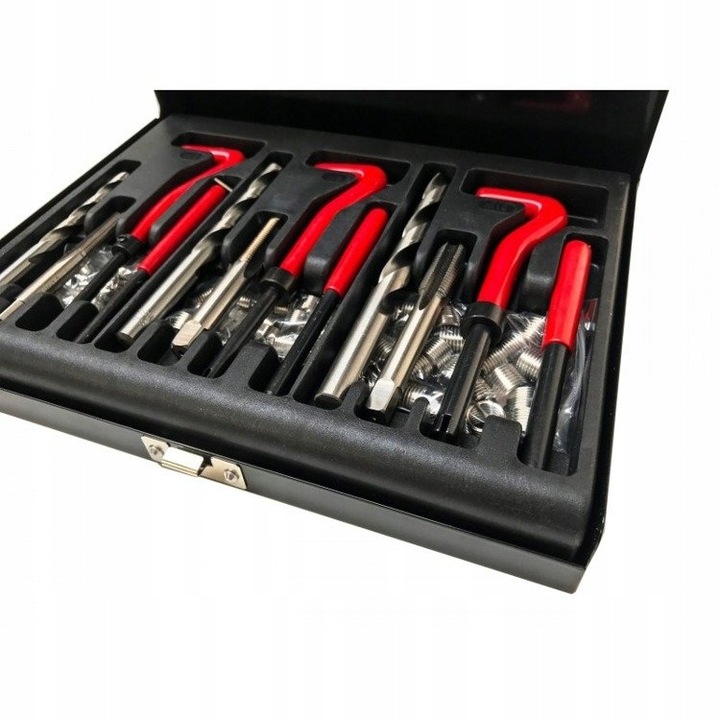 Wysokiej jakości zestaw do naprawy gwintów pozwalający na zastąpienie zniszczonych gwintów nową wkładką gwintową. Wiertła i gwintowniki wykonane zostały ze stali szybkotnącej HSS. Gwintowniki jednostopniowe nacinają gwint, w który wprowadza się wkładkę spiralną z twardej stali nierdzewnej. Do wprowadzenia wkładki służy pokrętło prowadzące oraz wybijak, który obłamuje wystającą końcówkę wkładki.